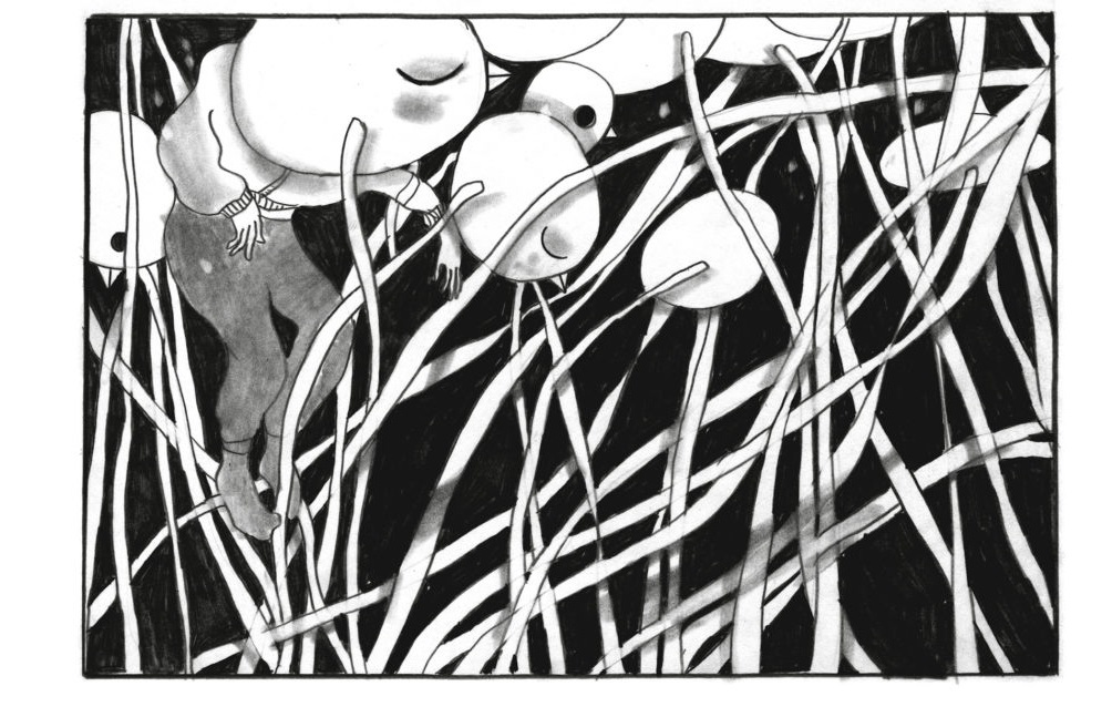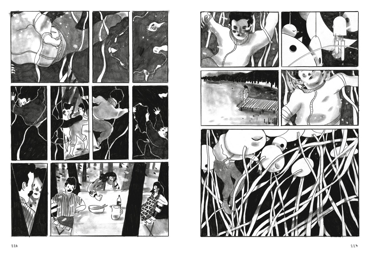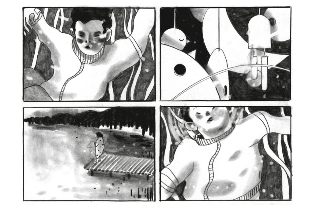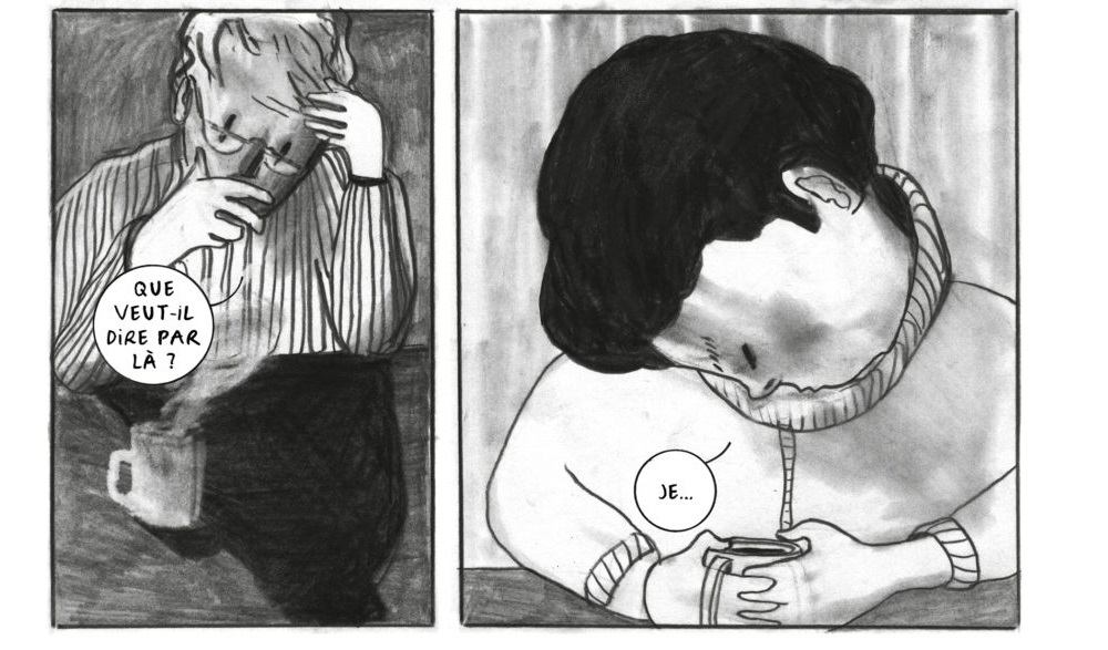 Sa partie graphique en noir et blanc est d’une grande douceur même dans les moments de tension de l’album. Son dessin souple d’un simple trait est agrémenté de noirs et de gris estompés ou grattés. Cela donne de très belles planches d’une grande mélancolie et d’une grande modernité.