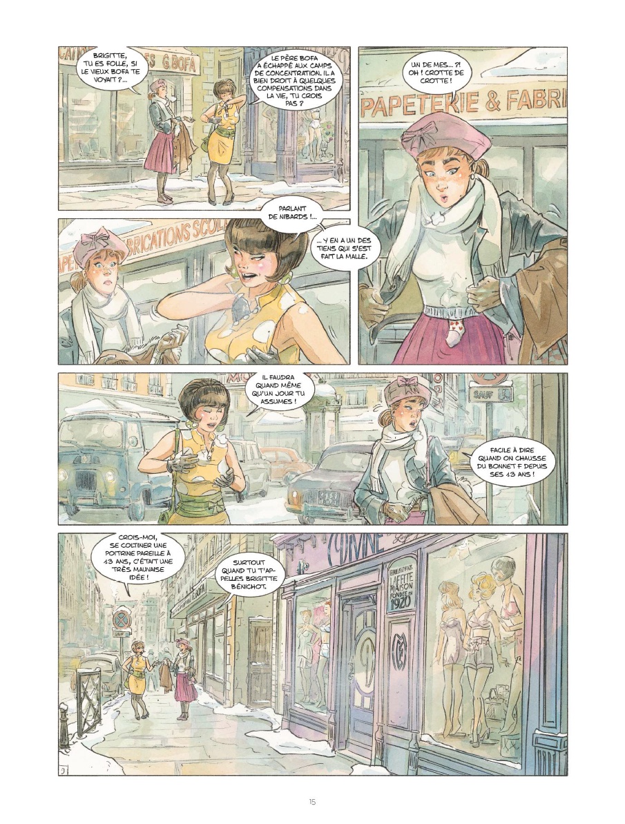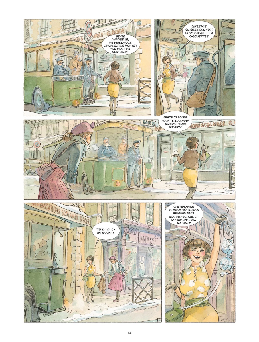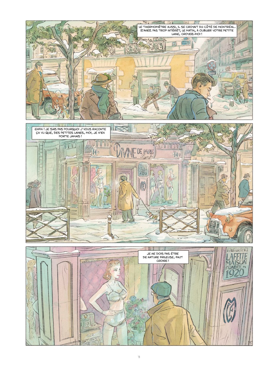 Il fait vraiment très froid en cet hiver 1958 à Paris. Un hiver « à rallonge » avec de la neige « en villégiature dans la capitale », où seuls les mannequins des vitrines osent encore se dénuder. Et c’est là, justement, chez Divine, une boutique de lingerie fine, que va se dérouler la belle histoire de La Crevette, un one-shot de 96 pages proposé par le tandem Zidrou ( scénario) et Salomone (Dessin). Ils signent ici pour le Lombard leur deuxième collaboration. Une réussite.