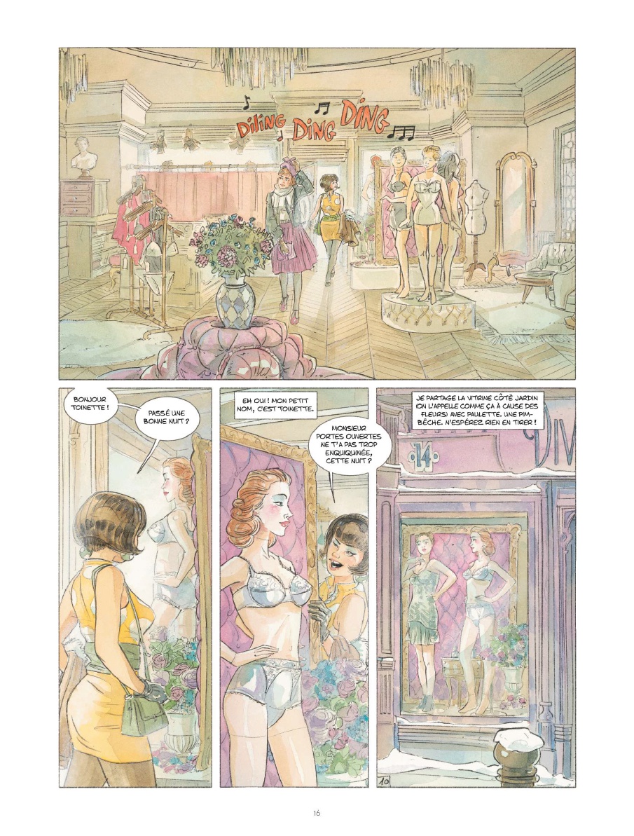 Autour de ce couple gravitent d’autres personnages hauts en couleur, comme cette Madame Ledoyen, la gérante, friande de punch lines comme » la lingerie fine, c’est le papier d’emballage de l’amour « ou encore, « une jeune femme en sous-vêtements tapera toujours plus fort dans l’œil du client qu’un boxeur en short ! ».