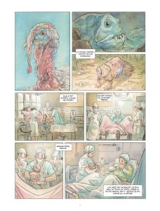 Mais voilà, un jour qu’Aline se rend aux toilettes, elle y surprend son patron assis sur la cuvette et devine son anatomie. Ce dernier est semble-t-il doté d’un micro pénis. A partir de cette situation scabreuse, les auteurs donnent un second élan à leur histoire. On comprend ainsi maintenant à quoi peut bien faire référence cette étrange crevette… Au fil des pages, le lecteur assiste à la naissance d’une histoire entre ces deux-là, le patron et son employée. Car si lui est bien mal pourvu, elle aussi finira par confier que son anatomie, en l’occurrence sa maigre poitrine, ne correspond pas non plus tout à fait aux canons de la beauté en vigueur à l’époque.