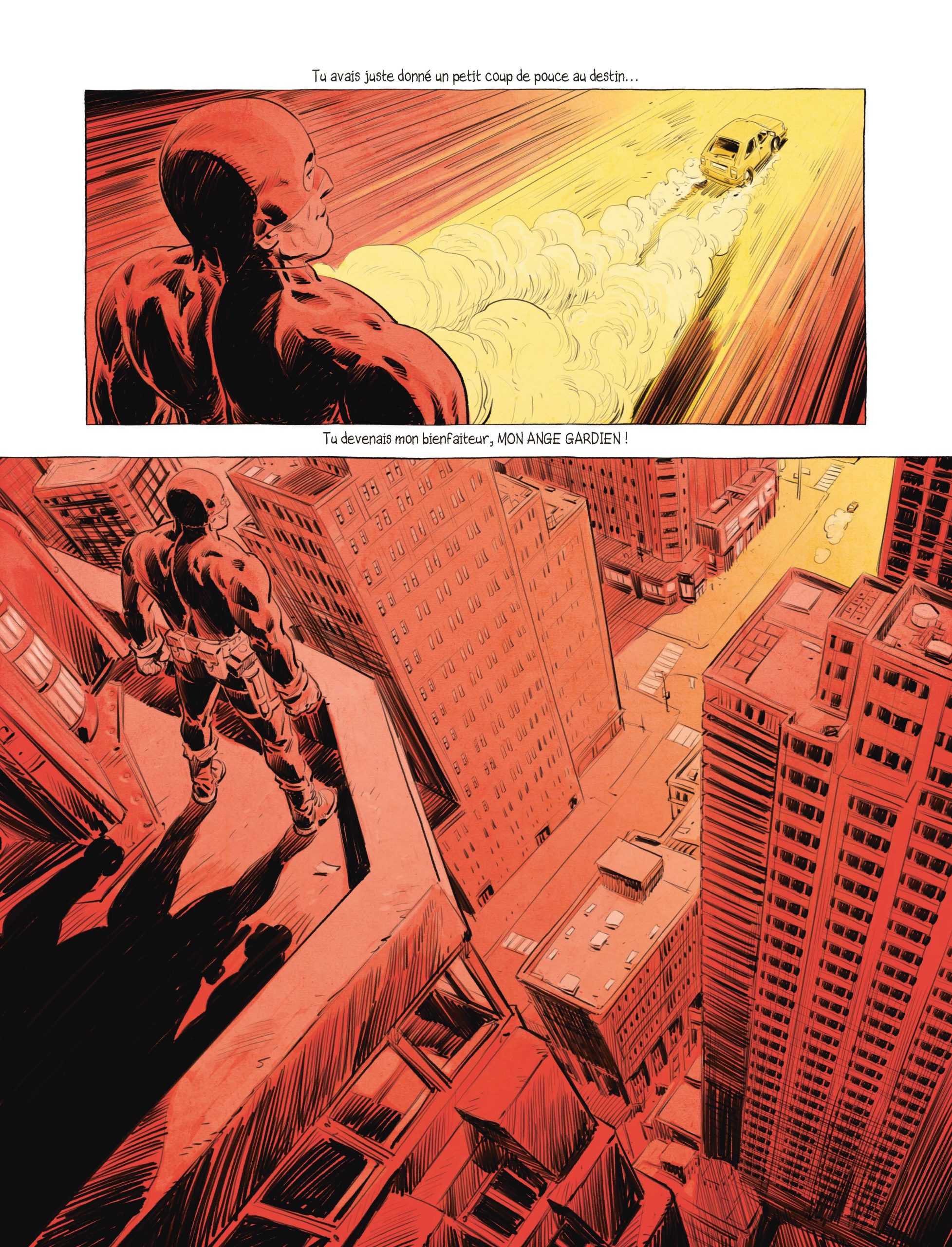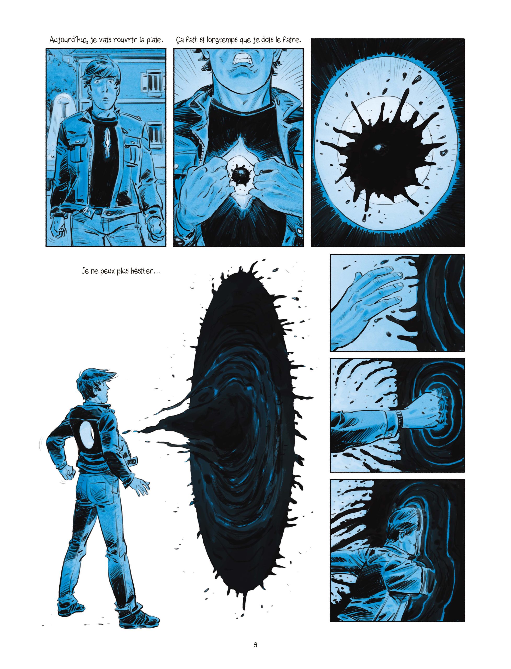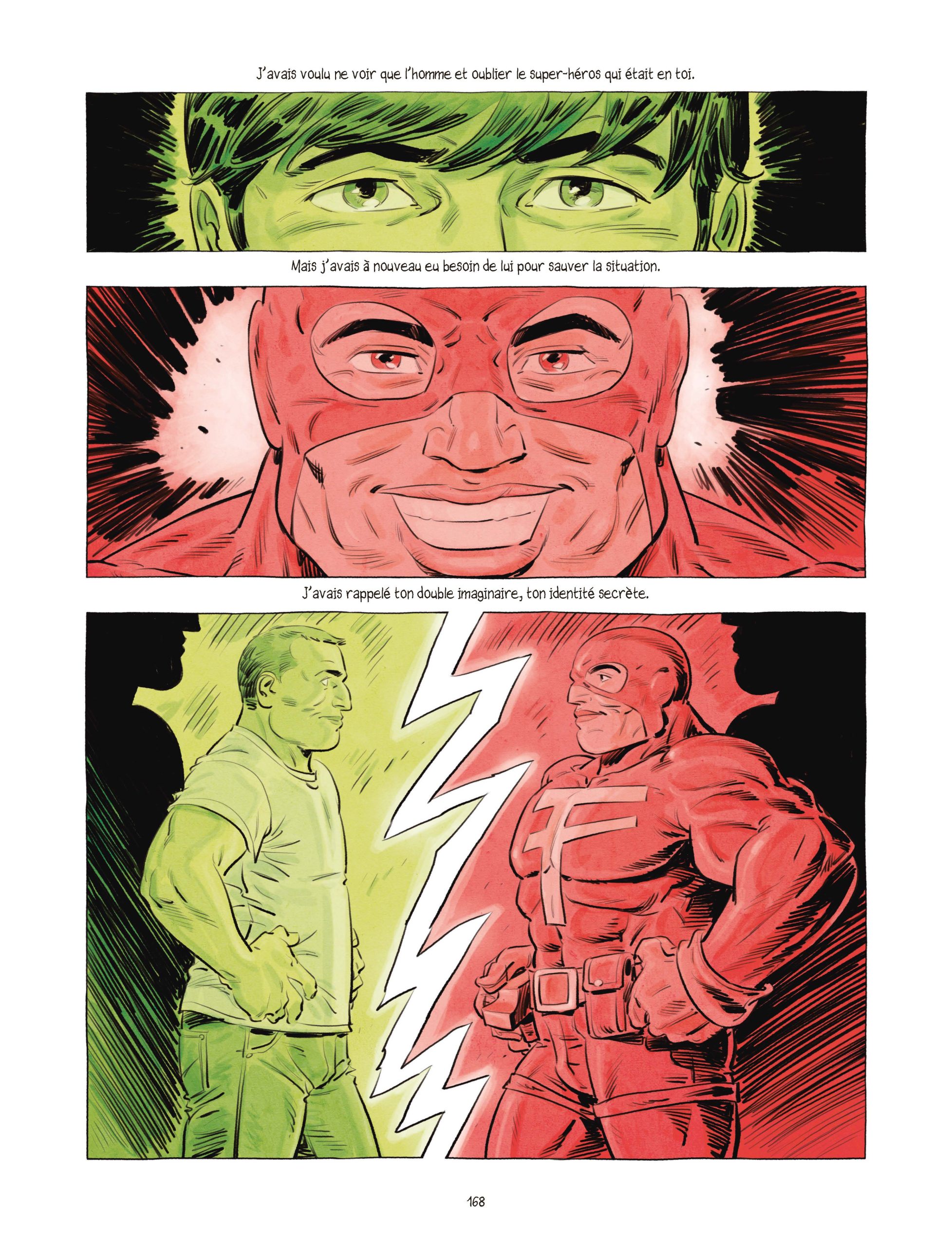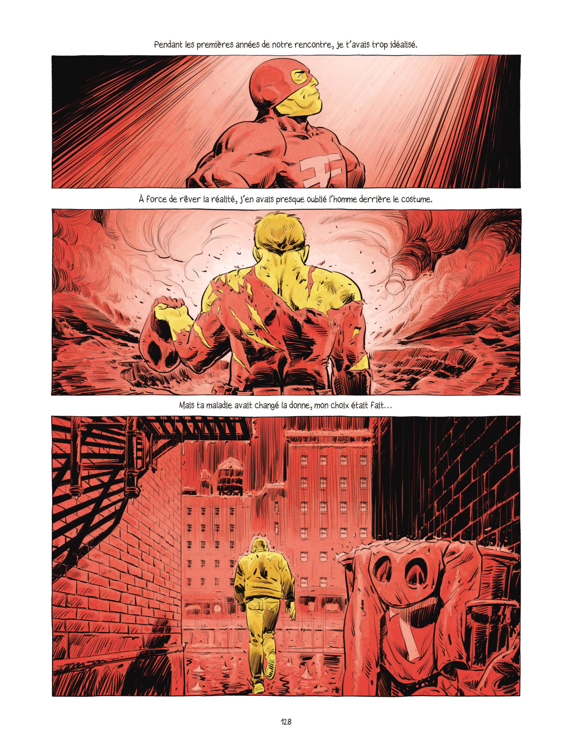 Que ce soit dans Face au Mur ou La Venin, Laurent Astier aime jouer avec le temps et les dates. Dans le premier, c’est dans un désordre chronologique qu’il dépeint la vie de Jean-Claude Pautot. Pour le second, l’épopée d’Emily est incessamment nourrie de flashbacks pour développer la quête de son héroïne. Dans La Force de Vivre, Laurent Astier jongle différemment avec la temporalité. Ici, pas de dates mais des couleurs : le bleu pour la mélancolie du présent, le doré pour les années heureuses, le vert pour les épreuves médicales, le rouge pour la fusion et les scènes du super-héros « The Force », ce symbole.