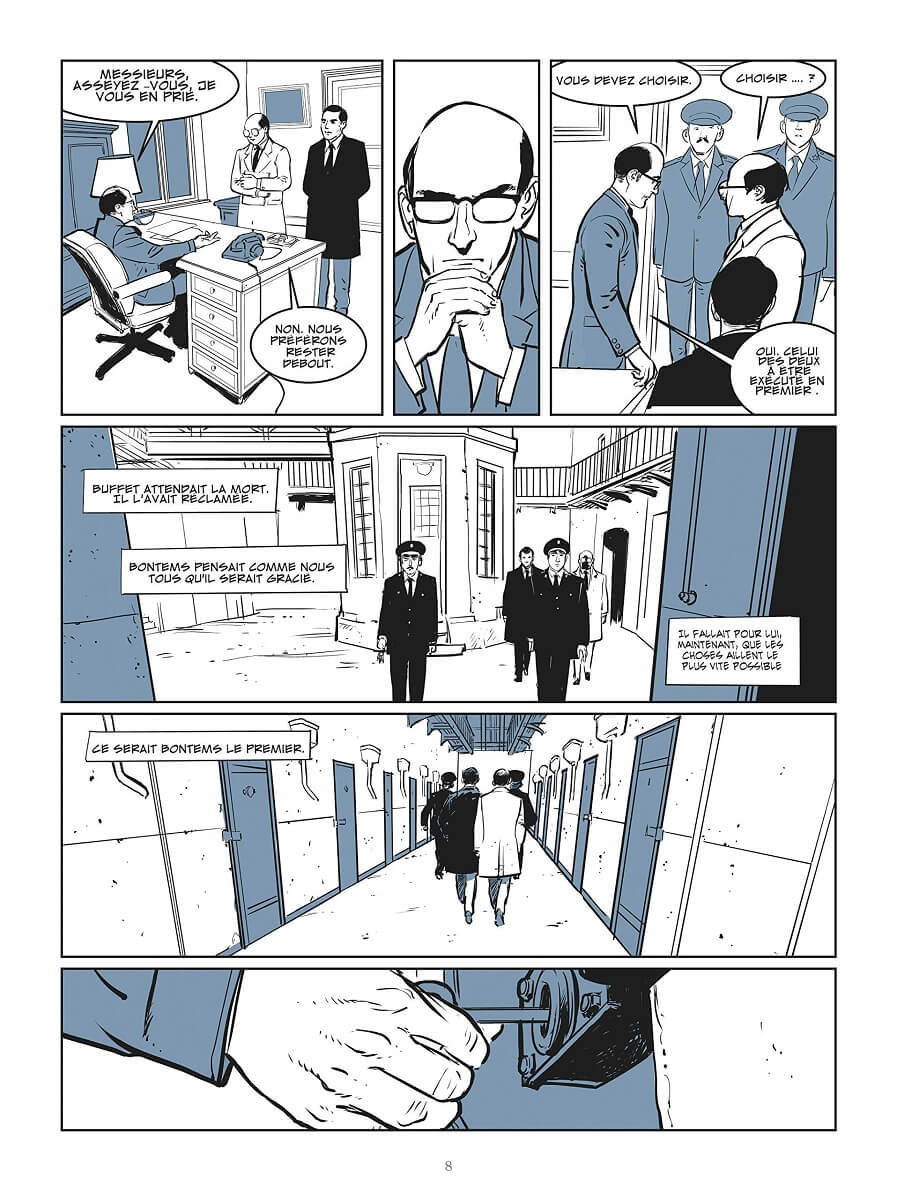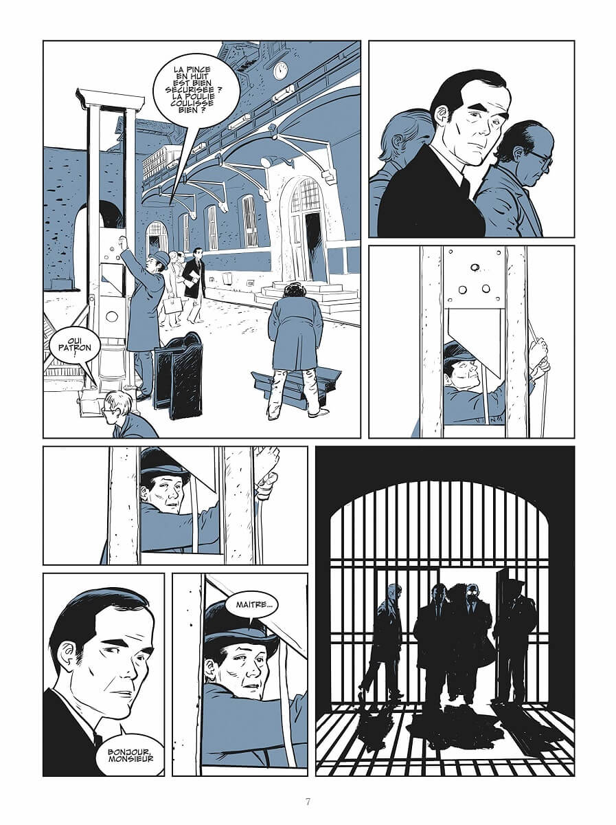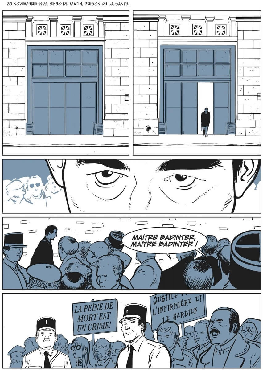 Résumé de l’éditeur : « C’est la mort que vous réclamez. Pas la justice. »1972. Dans la nuit du 27 au 28 novembre, Robert Badinter, avocat, assiste impuissant à l’exécution par guillotine de son client Roger Bontems. Incapable de se résoudre à l’idée qu’on ait pu mettre à mort celui qui n’a pas tué, il fait de l’abolition de la peine de mort - cette sanction qui rend chacun de nous complice d’un assassinat commis par l’État, le combat de sa vie. Quelques années plus tard, c’est Patrick Henry qui est promis à l’échafaud. Qu’importe, si Badinter n’a pas pu sauver l’innocent, il sauvera le monstre. Car ce n’est pas le kidnappeur et meurtrier d’enfant qu’il doit défendre, mais la sanction capitale qu’il doit éradiquer. Le procès de Patrick Henry s’apprête à entrer dans l’histoire comme celui qui verra disparaître la peine de mort en France…Ce passionnant roman graphique, centré sur deux des procès les plus emblématiques de Robert Badinter puis sur son accession au poste de Garde des sceaux, revient sur un pan essentiel de l’histoire judiciaire française : le combat pour l’abolition de la peine de mort.