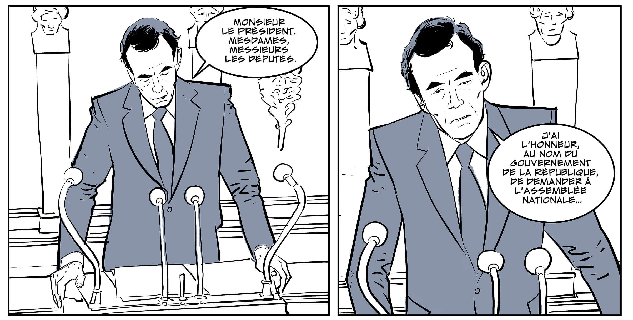 Pour mettre cet album en image, rien de tel que d’avoir demandé à Malo Kerfriden. Les planches de l’auteur de KGB et Otaku Blue sont sobres mais d’une grande force graphique. A l’image de Simone Veil l’immortelle (de Duphot et Bresson), il opte pour une colorisation en bichromie noire et bleue, très belle.