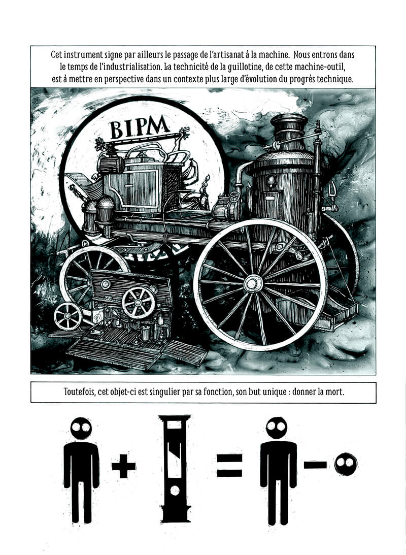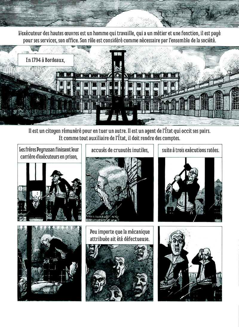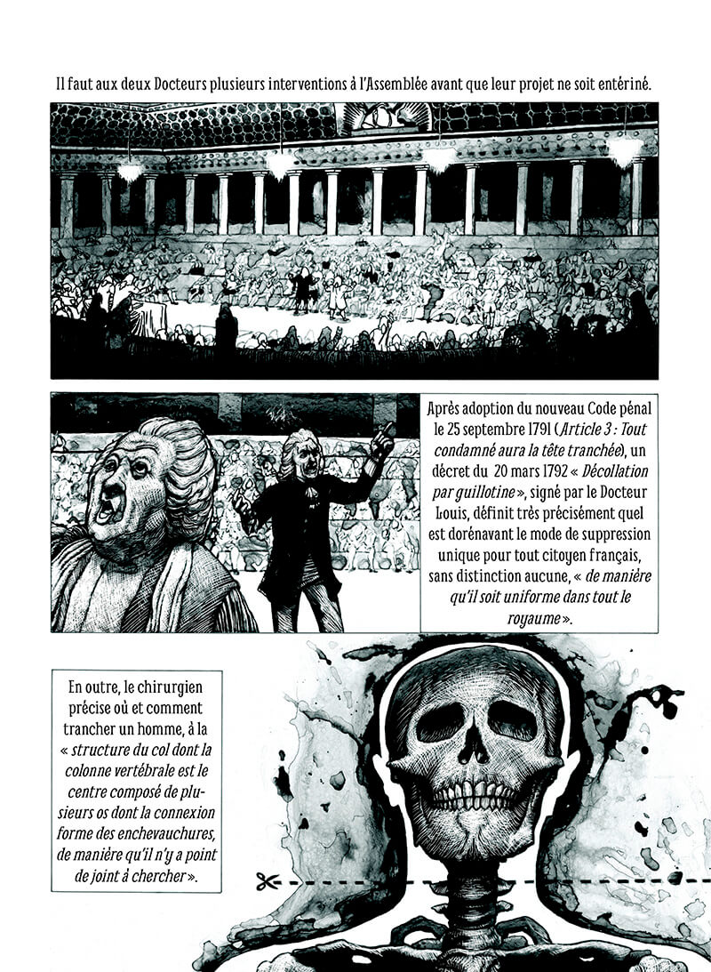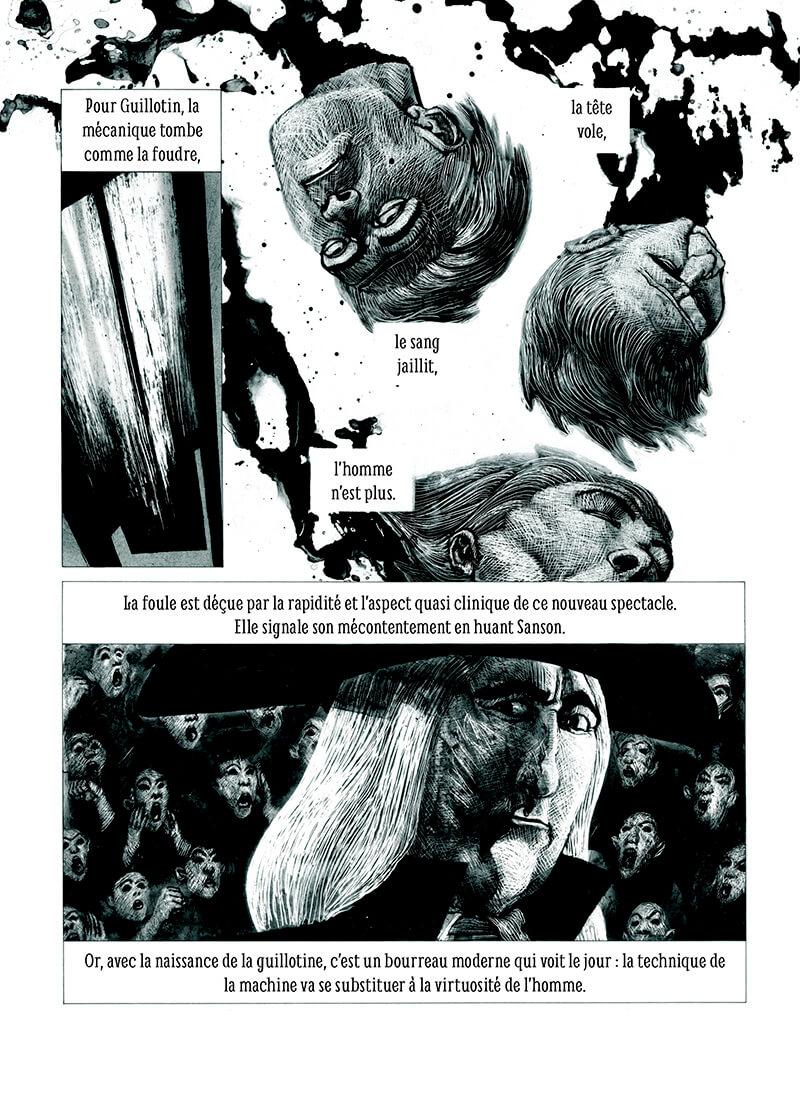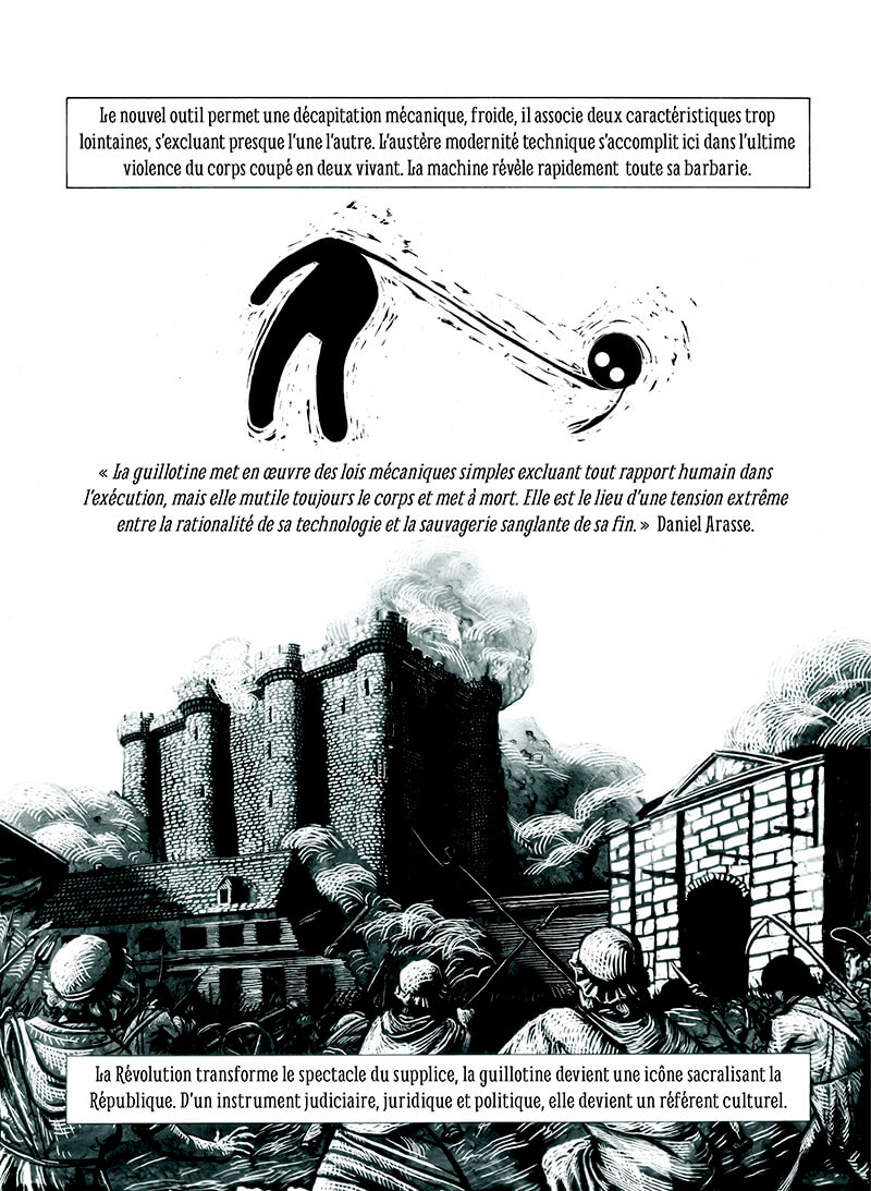 Louisette, Monte-à-regret, la Veuve ou le Rasoir national, les gens lui ont donné des surnoms pour l’incarner et prendre de la distance vis-à-vis d’elle. Les techniques pré-guillotine sont détaillées, l’objet et ses caractéristiques techniques sont mis à nu sous toutes ses coutures. La manière dont la lame doit trancher et le peuple qui assiste avec ferveur aux mises à mort, tout est là, sans filtre.