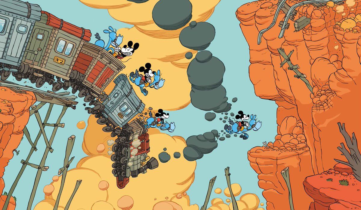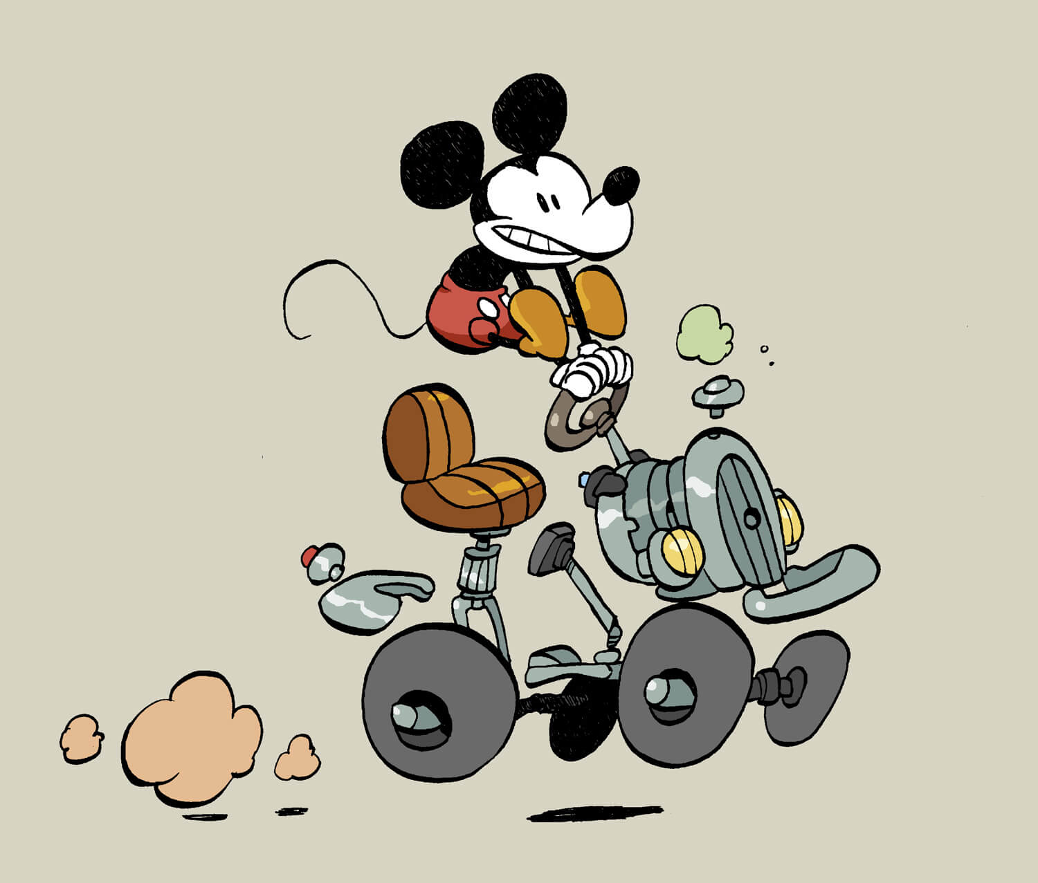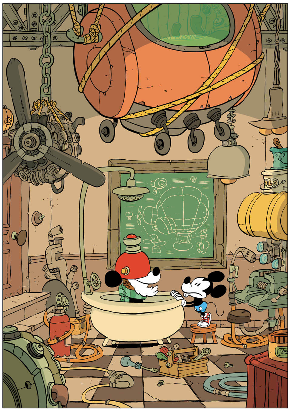 La jeunesse de Mickey bénéficie du trait humoristique et minimaliste de Tébo pour atteindre son but. Son dessin tout en rondeur magnifie (en étant proche) l’univers de Walt Disney. Les grands aplats de couleurs illuminent ses planches très vivantes. On en redemande, encore et encore !