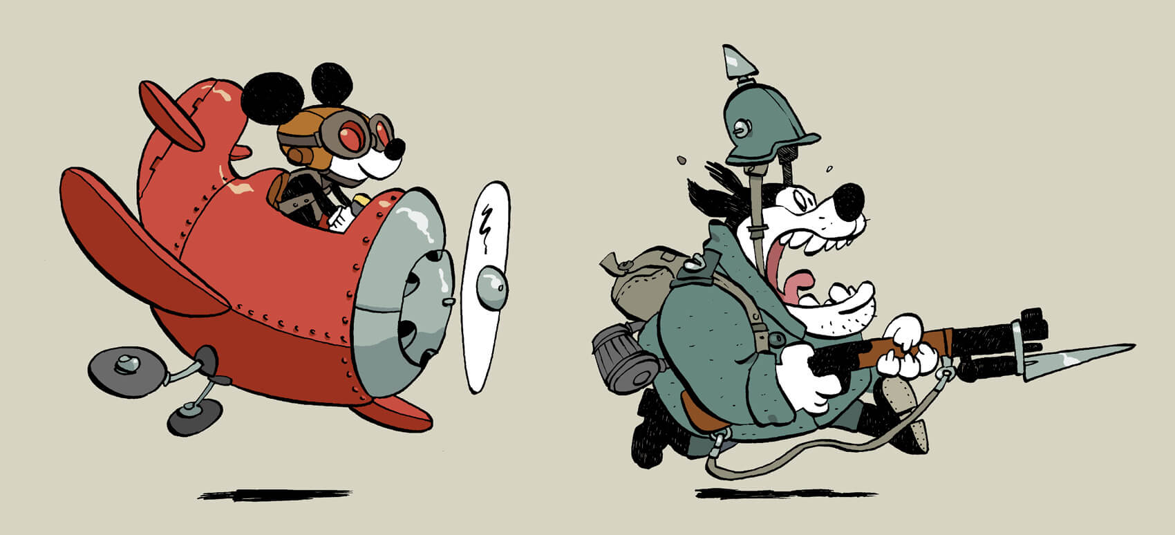 - Le messager de la paix. A la fin de la Première Guerre Mondiale, un général demande à Mickey d’aller porter la bonne parole dans un endroit reculé : le conflit est terminé. Arrivé sur place, il découvre qu’un soldat allemand, Pat Hibulaire, a coupé volontairement les poteaux de télécommunication…