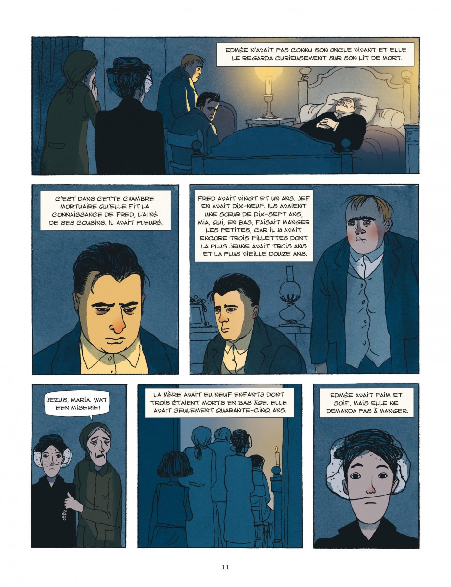 Nous sommes en Belgique, en 1931. La jeune Edmée, dont le père vient de mourir, quitte la capitale belge pour aller vivre chez ses cousins, en Flandre. Changement de décor. La ville cède la place à une morne campagne sillonnée de canaux. C’est là que vivent ses cousins Van Elst, dans une famille de six enfants. Ils sont « taiseux », chacun et chacune semblant vivre avec de lourds secrets. Quand Edmée descend du train pour rejoindre la propriété des Van Elst, elle arrive dans une famille en deuil. Après son père, c’est son oncle qui vient de mourir…