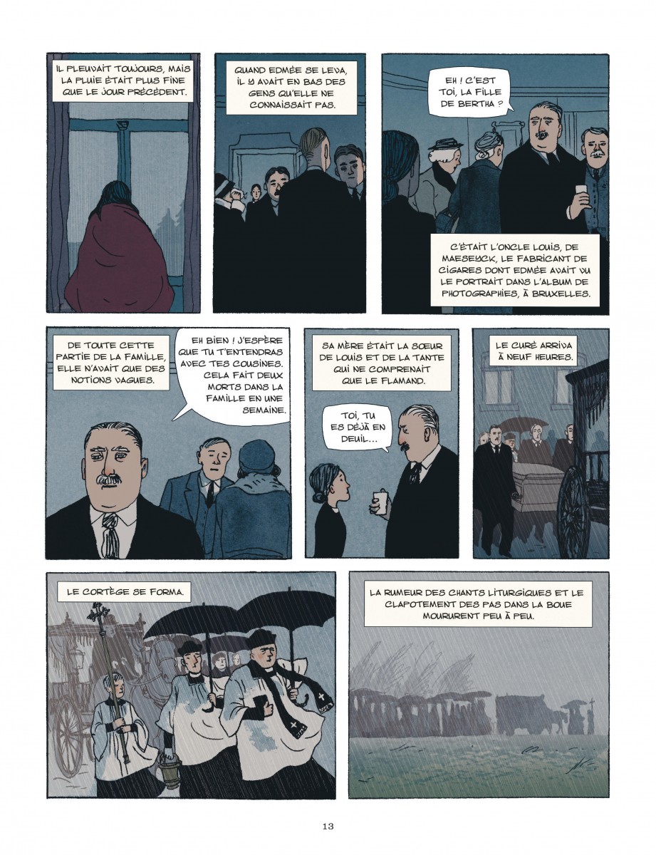 Résumé de l’éditeur. À la mort de son père, Edmée, une jeune fille de 16 ans, quitte Bruxelles pour s’installer chez des cousins, au coeur de la Flandre. Le contraste est brutal entre les lumières de la grande ville et l’ambiance pesante de la campagne flamande, sillonnée de canaux et plongée dans une lumière blafarde. Pour Edmée, le choc est d’autant plus rude que, le jour de son arrivée, c’est le père de sa nouvelle famille qui décède à son tour. Pour ne rien arranger, elle découvre que les finances familiales se révèlent moins florissantes qu’annoncé. Désormais, elle va devoir apprendre à se faire une place parmi ses six cousins et cousines, aux tempéraments si différents. Entre attirance et répulsion, entre lourds secrets et jeux de séduction parfois ambigus, l’atmosphère se délite peu à peu, ouvrant la voie à un drame que rien ni personne ne pourra empêcher…
