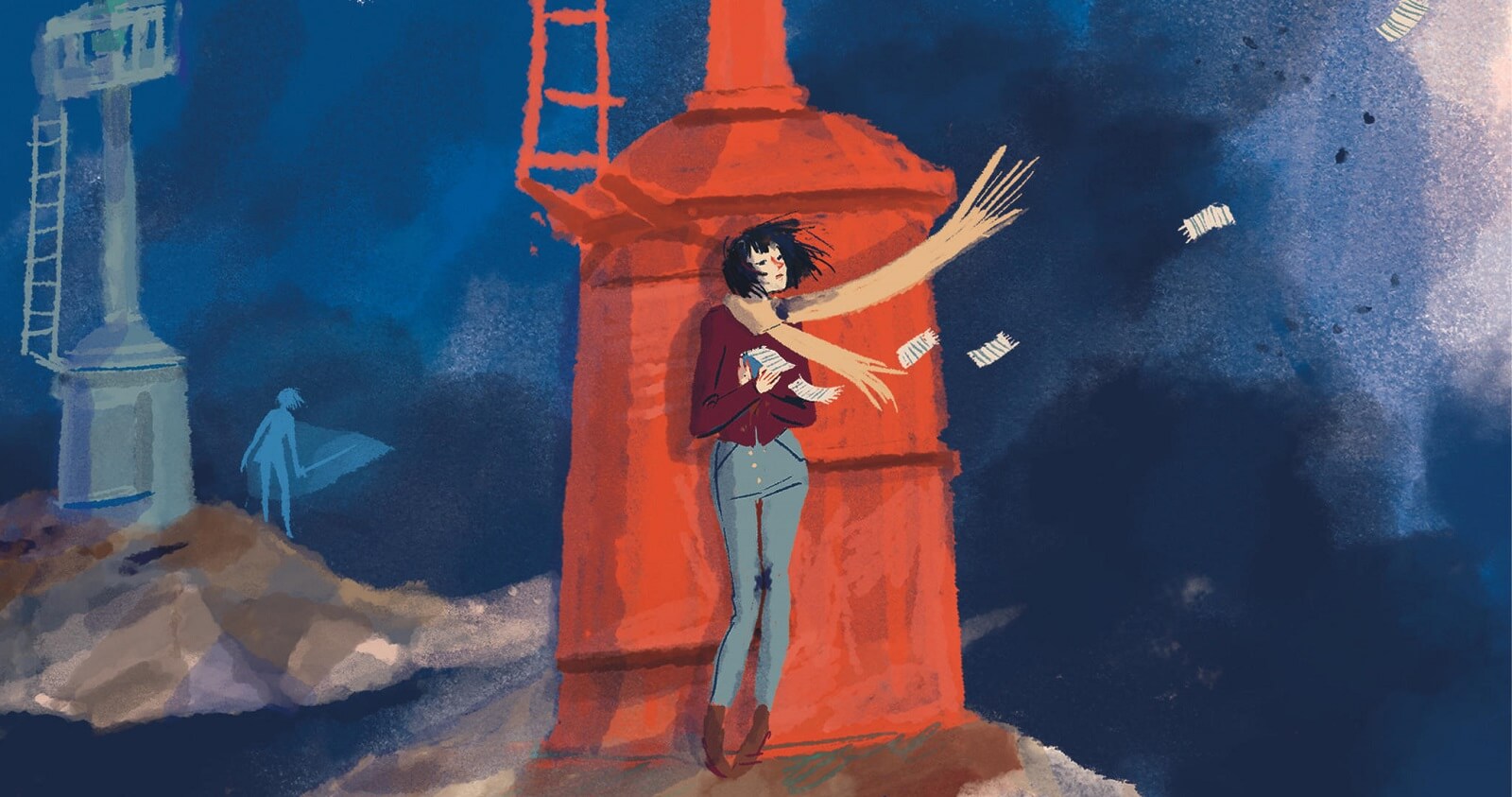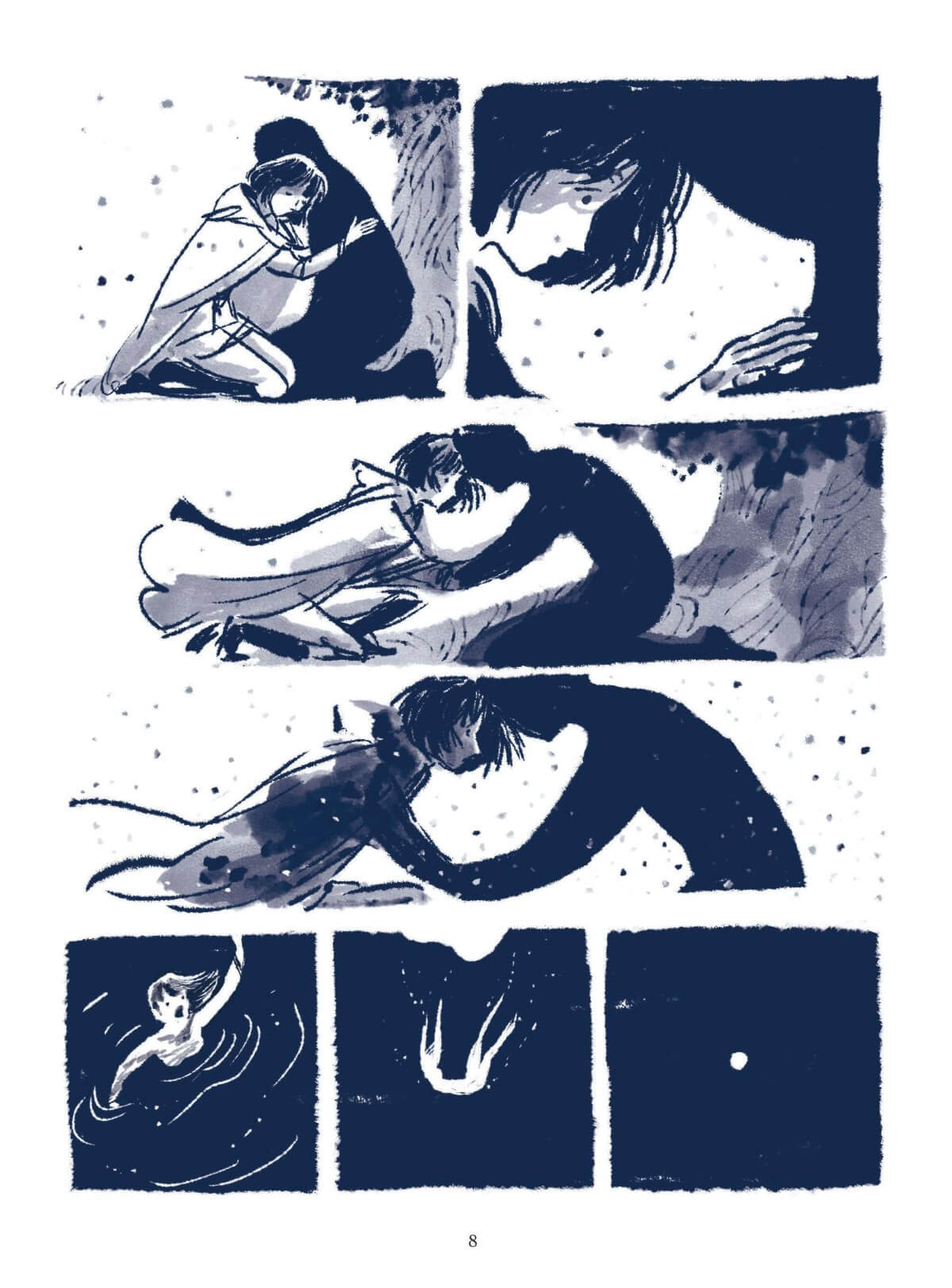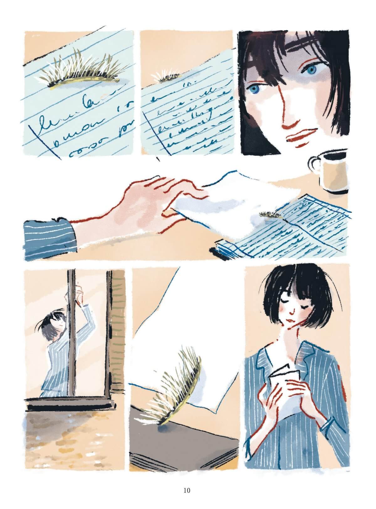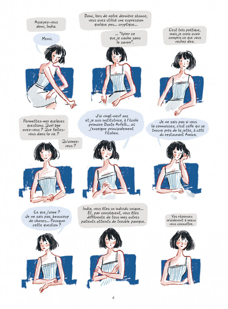 Résumé de l’éditeur : India est sujette à des crises de panique. L’air lui manque soudain au point de la faire suffoquer. Pourtant, elle a tout pour être heureuse : un compagnon, qui l’aime – Pier – et un métier qu’elle adore – institutrice. Mais quand une de ces attaques la surprend en pleine classe, les parents mettent la pression sur la direction pour qu’elle soit licenciée. Quant à Pier, il est perdu. Peu à peu, elle prend conscience que chercher à vaincre son « ennemi » est vain. Et qu’il vaut mieux tenter de l’apprivoiser. En parallèle à la thérapie qu’elle entame dès le premier chapitre, elle a recours à l’écriture et fait appel à son imagination. Une belle histoire de résilience intime délicatement mise en scène par un dessin hyper sensible et une palette de couleurs tout en nuances et en fragilité. Le noir, magnifique et inquiétant, illustre les états dans lesquels est plongé le personnage et les contes qu’elle raconte à ses élèves.