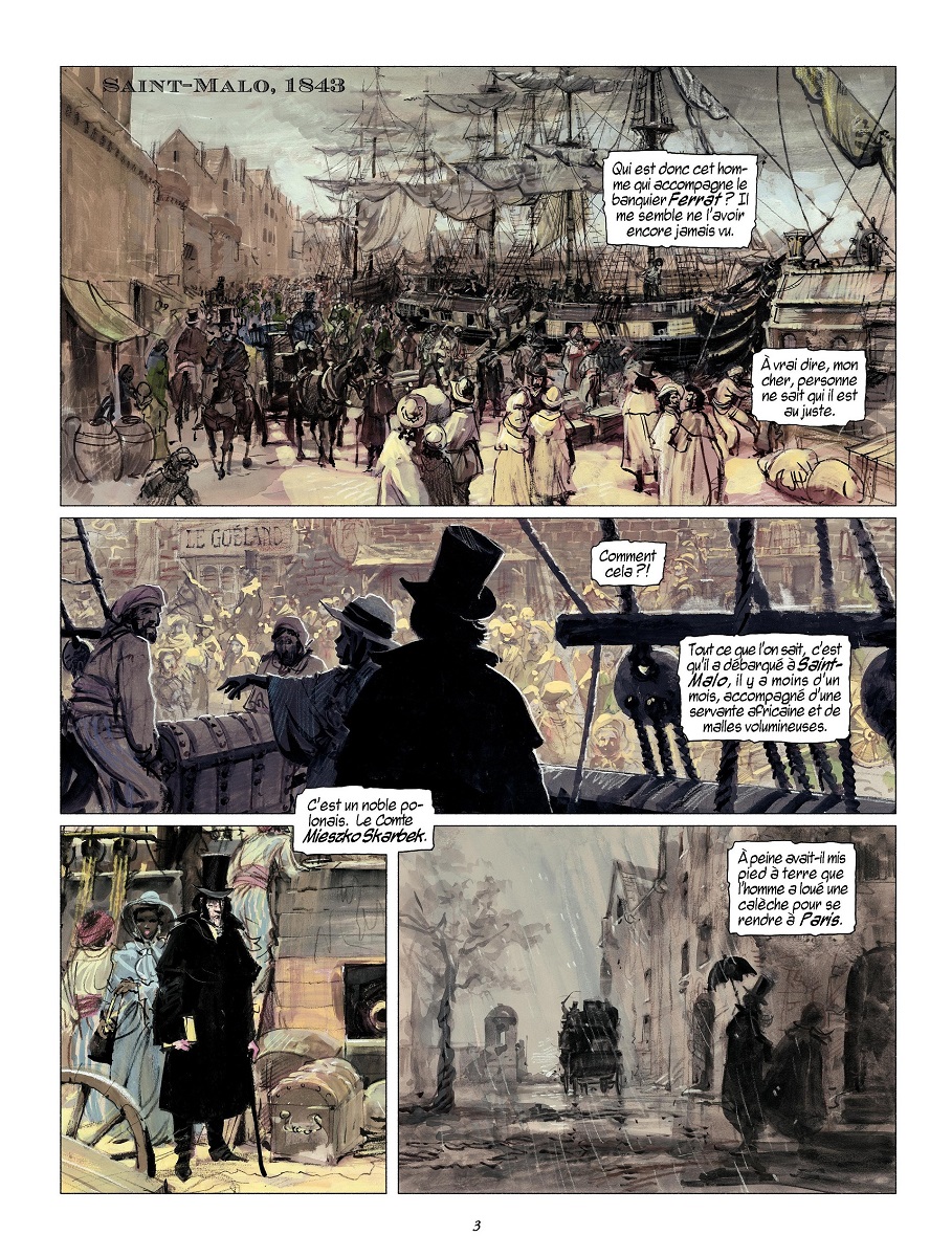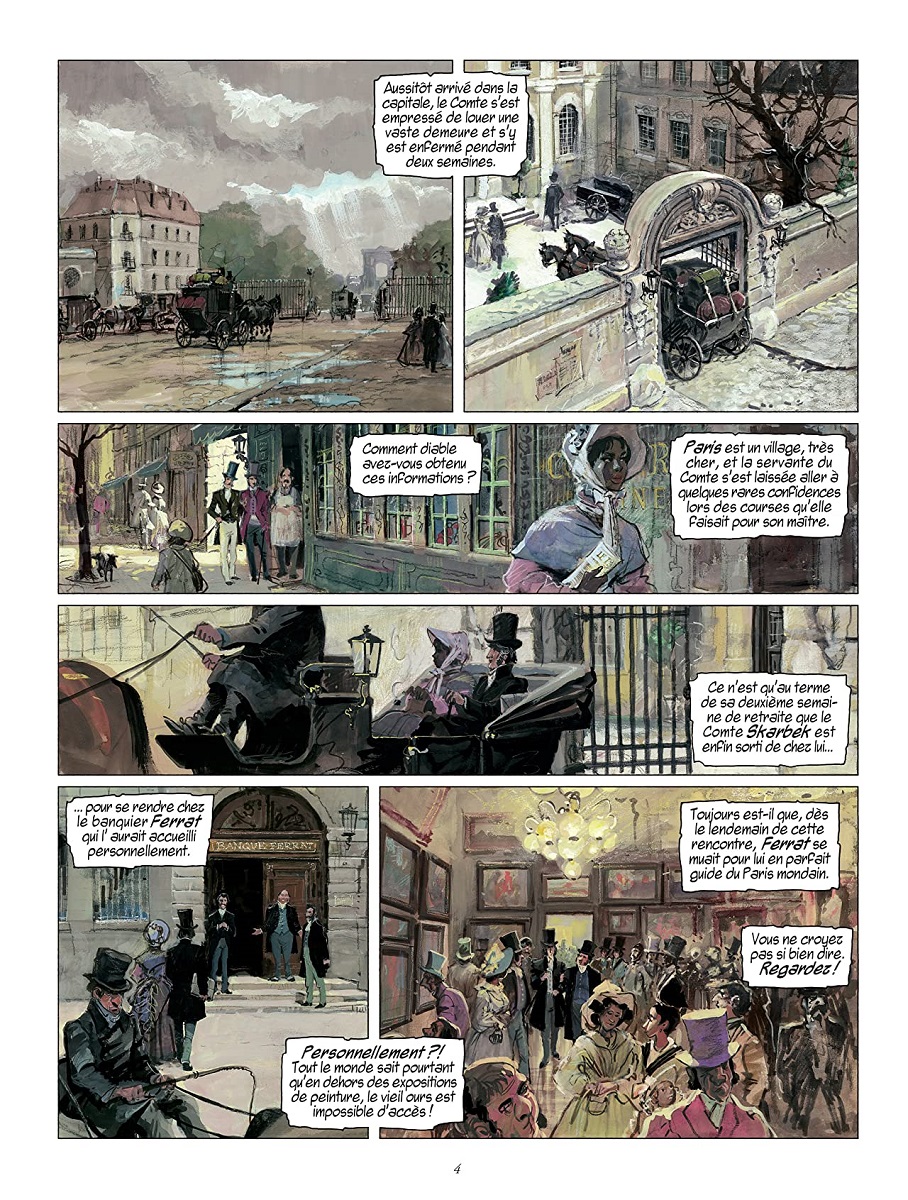 Résumé de l’éditeur : Nous sommes en 1843. La Vengeance du Comte Skarbek raconte, dans un diptyque formidablement mis en scène par Grzegorz Rosinski, les tribulations romanesques d’un peintre, Louis Paulus, de retour d’exil. Sous l’identité du Comte Skarbek, le peintre revient à Paris pour confondre un célèbre marchand de tableaux, Daniel Northbrook. Pour ce faire, il usera des « talents » de son ancienne muse, la belle Magdalène. Flash-back et témoignages ponctuent le procès plein de rebondissements qui s’étalera sur les deux albums. On ne s’attend pas à un tel dénouement, qui mêle fiction et réalité, revisite même l’Histoire et fait tomber les masques de la plus surprenante des façons. Du grand art ! Un passionnant thriller romanesque dans la lignée des grands feuilletons populaires de Victor Hugo et d’Alexandre Dumas. La Vengeance du Comte Skarbek est une fiction rigoureusement documentée, qui dépeint avec réalisme la société parisienne et l’univers des artistes romantiques du 19e siècle.