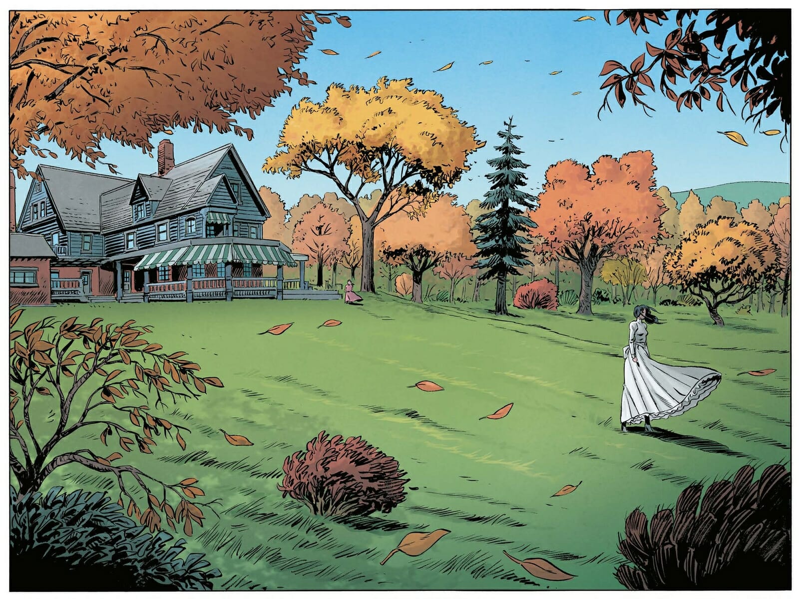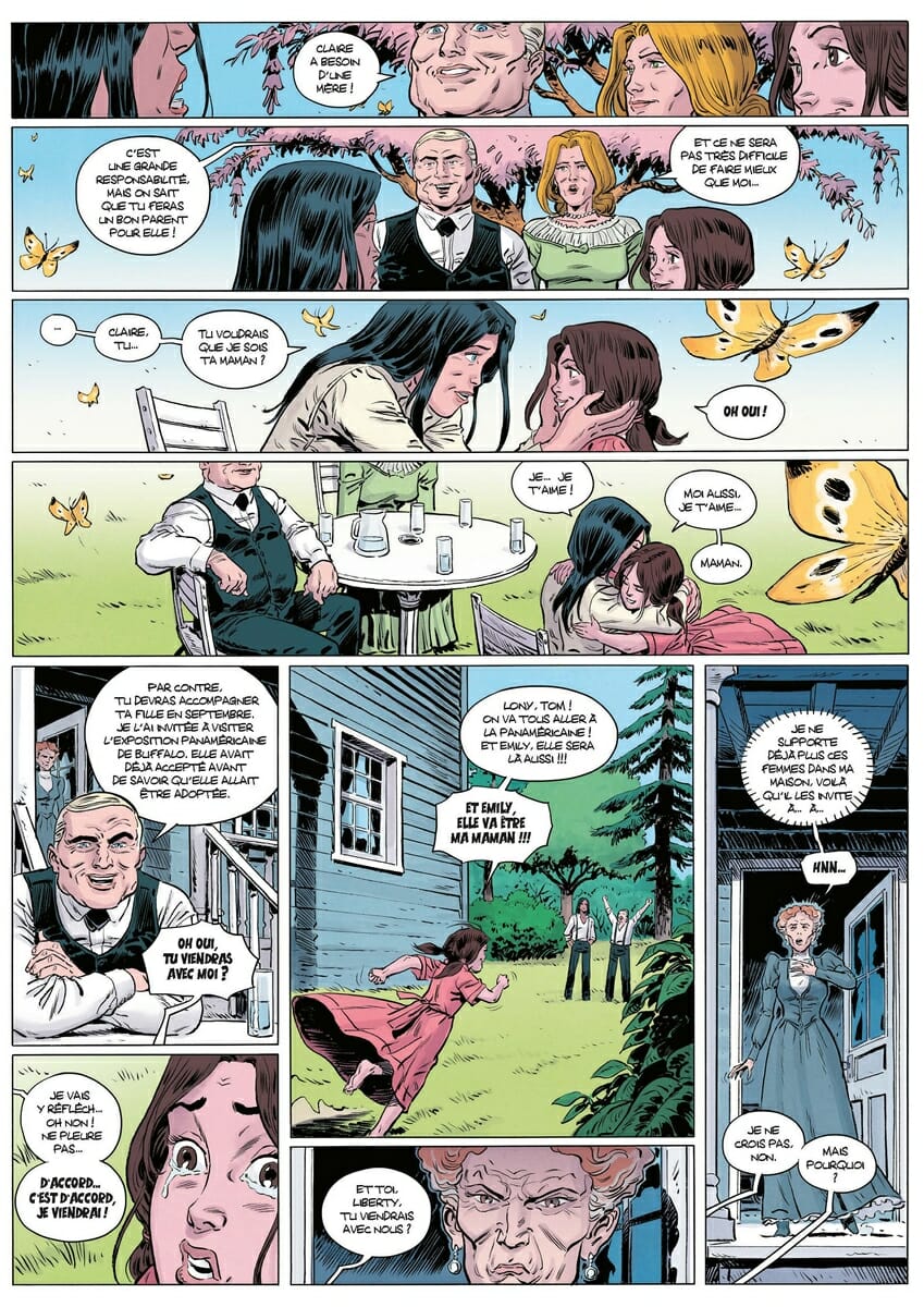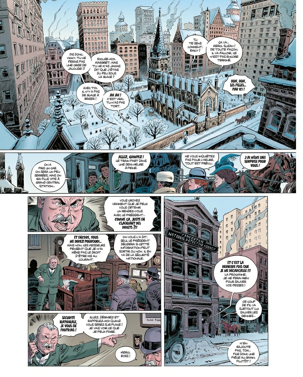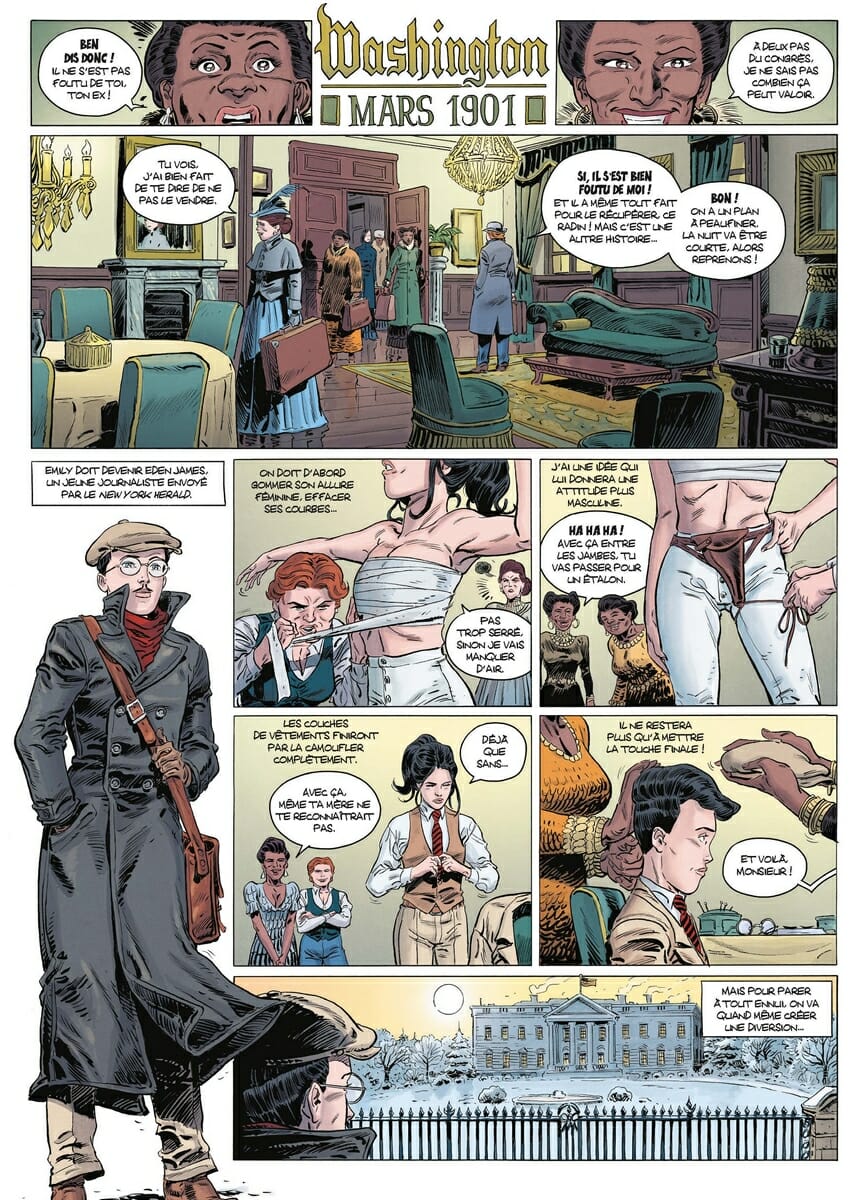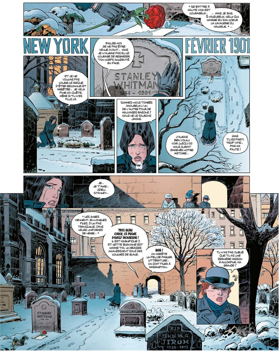 New-York en 1901. Comme un symbole, le seul homme présent dans cette première planche se trouve six pieds sous terre. Telle une union sacrée, c’est entourée des ses fidèles amies qu’Emily cite le poème de l’écrivaine Emily (!) Dickinson devant la tombe de son amour éphémère, Stanley Whitman. Bien qu’attristée par sa perte, elle ne perd pas de vue son ultime objectif : approcher William McKinley, l’actuel Président des Etats-Unis.