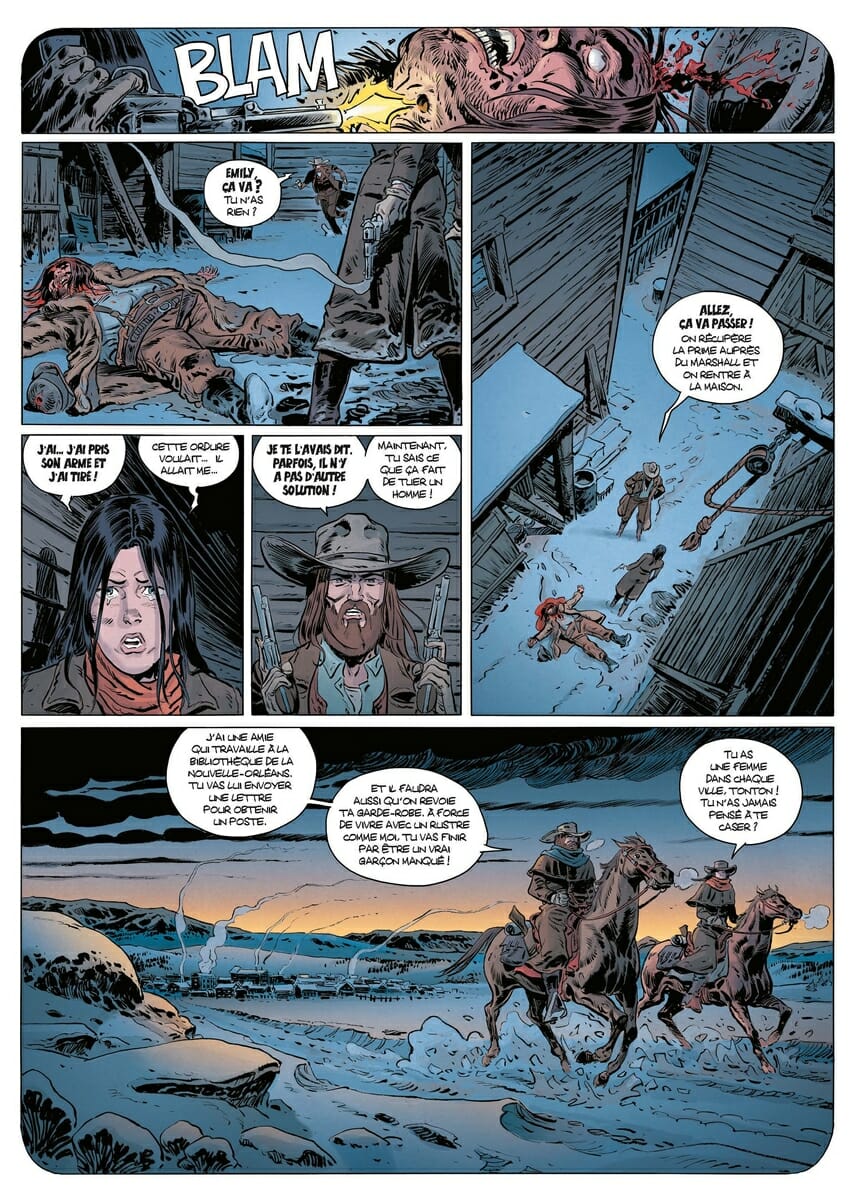 Toutes les séries ont une fin. Celle qui met en scène une des plus marquantes héroïnes des westerns d’aujourd’hui, se termine avec une sororité qui s’est construite au fil des albums. La Venin qui était en quête de justice et dont la haine motivait ses actes de violence, va trouver les réponses qui lui manquaient. Et ce n’est pas forcément celles qu’elle espérait. Pour autant, l’issue de son aventure parsemée de déception trouvera une certaine forme de quiétude. C’est ainsi que l’auteur met fin aux aventures de La Venin (pour l’instant ?) pour que celles d’Emily puissent commencer. Sereinement.