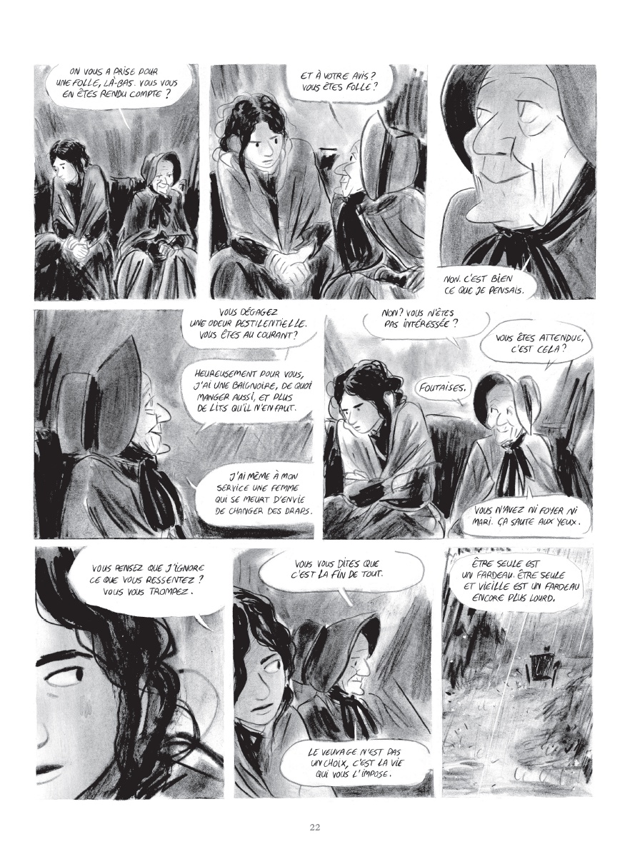 Mais Mary, bien que d’apparence fragile, va au cours de cette folle cavale se révéler de plus en plus forte et déterminée. Des rencontres, parfois heureuses, vont l’y aider. Ainsi cette vieille femme qui lui offre un temps l’hospitalité et qui en peu de temps semble tout saisir des malheurs de Mary : « Je sais exactement où vous en êtes. Vous vous dites que c’est la fin de tout. Le veuvage n’est pas un choix: c’est la vie qui vous l’impose. Être seule est un fardeau ».