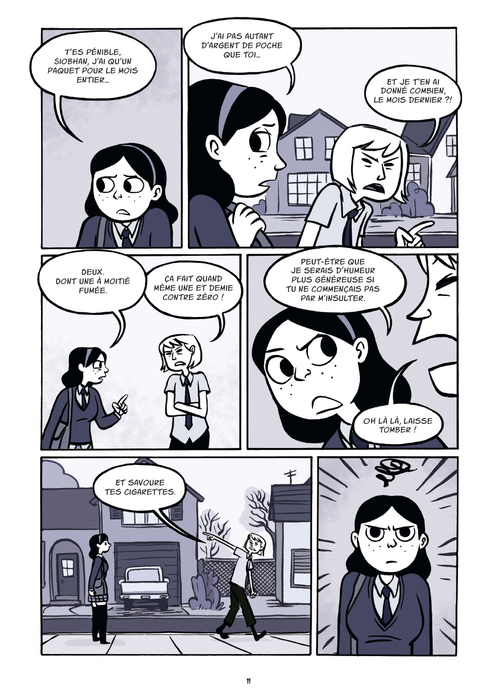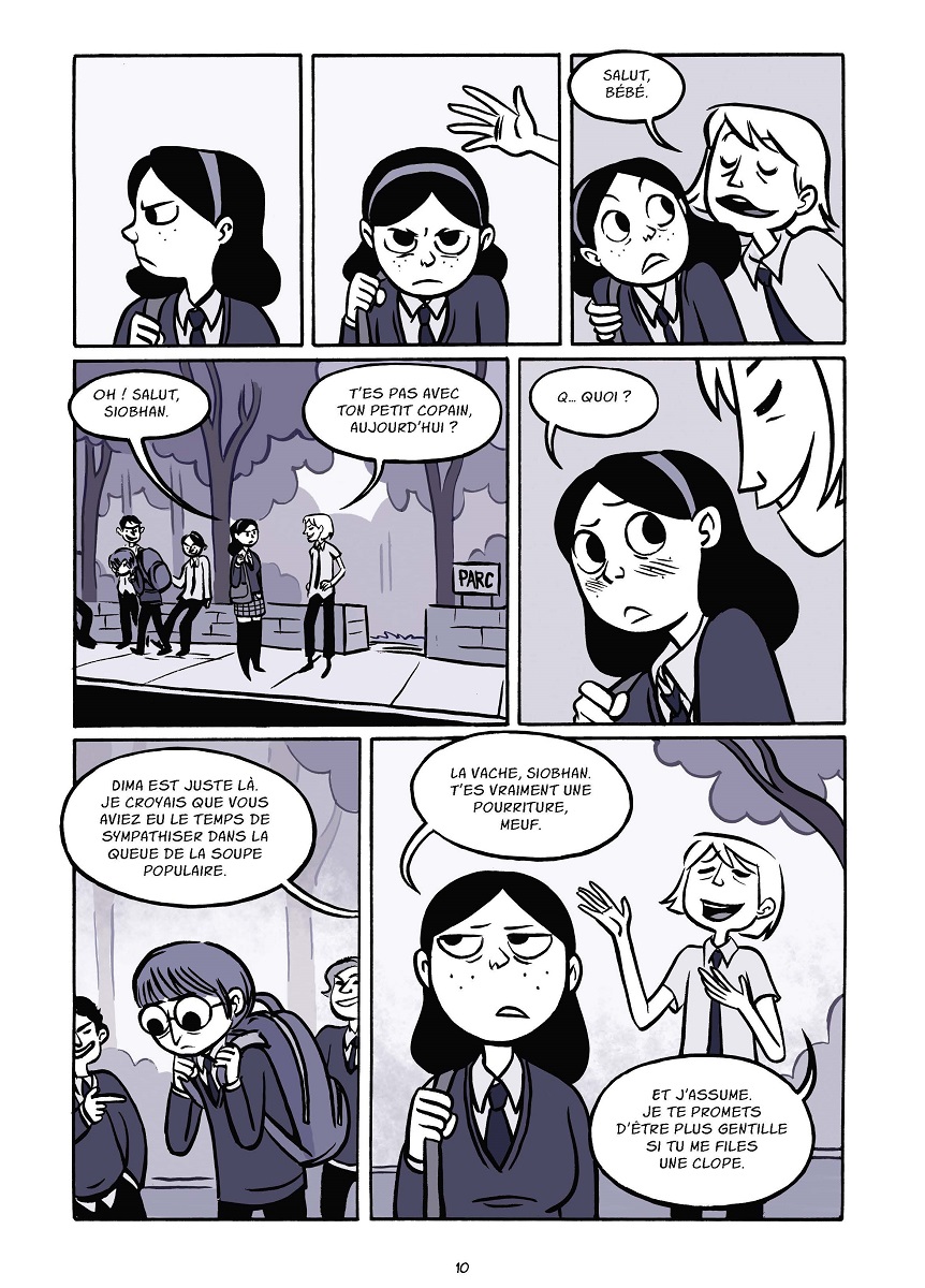 En allant à l’école, elle retrouve sur son chemin, Shioban, sa meilleure amie au look très garçon, mais ne parle jamais avec Dima, élève tout chétif et très intelligent.