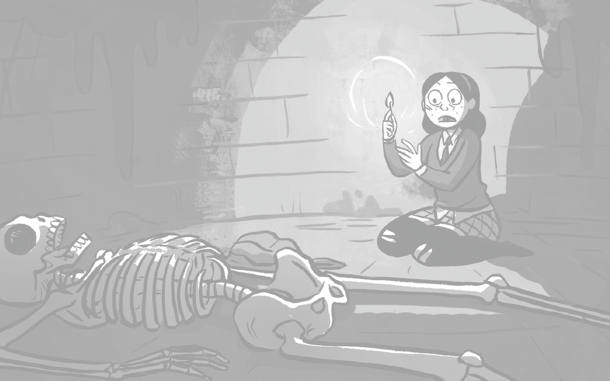 Elle crie mais personne ne l’entend. Pire, elle tombe nez à nez avec un squelette. Apparaît alors le fantôme de ce tas d’os; celui d’une adolescente tombée elle aussi dans ce puits. Une étrange discussion s’engage entre elle…