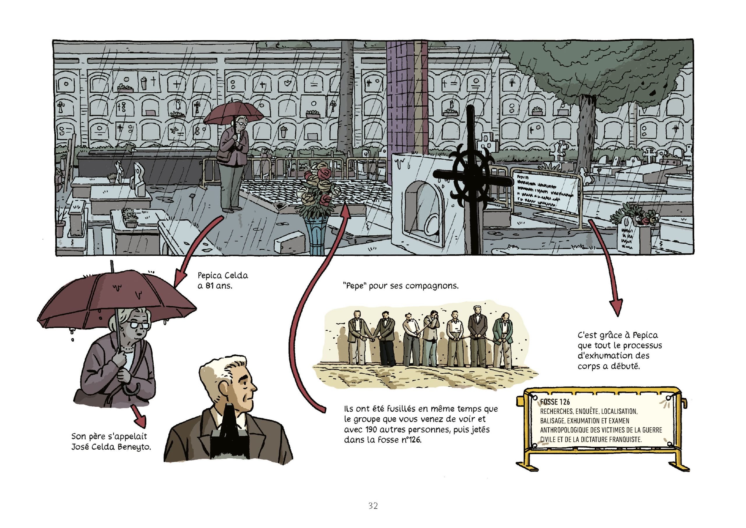 Résumé éditeur : Le 14 septembre 1940, 532 jours après la fin de la guerre civile espagnole, José Celda est fusillé par le régime franquiste et enterré dans une fosse commune avec onze autres hommes. 70 ans plus tard, sa fille, âgée de huit ans au moment des faits, parvient à localiser sa dépouille… Les auteurs accompagnent Pepica Celda dans son parcours douloureux au coeur d’une nation qui a choisi l’oubli.