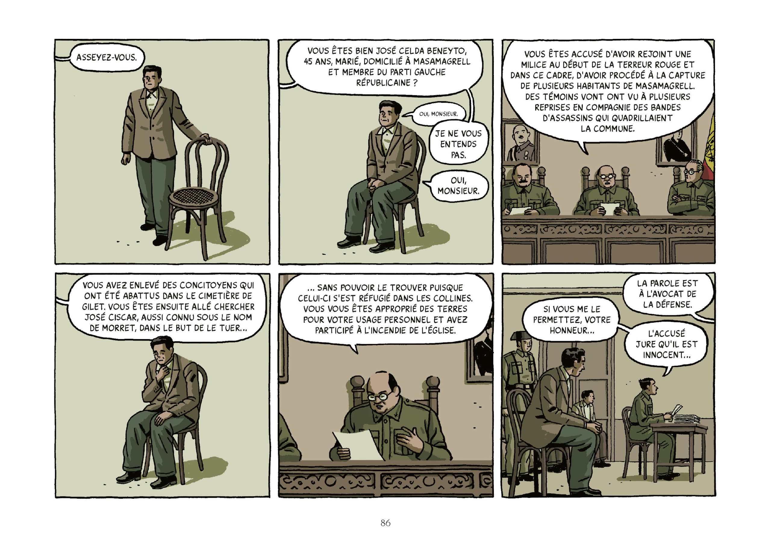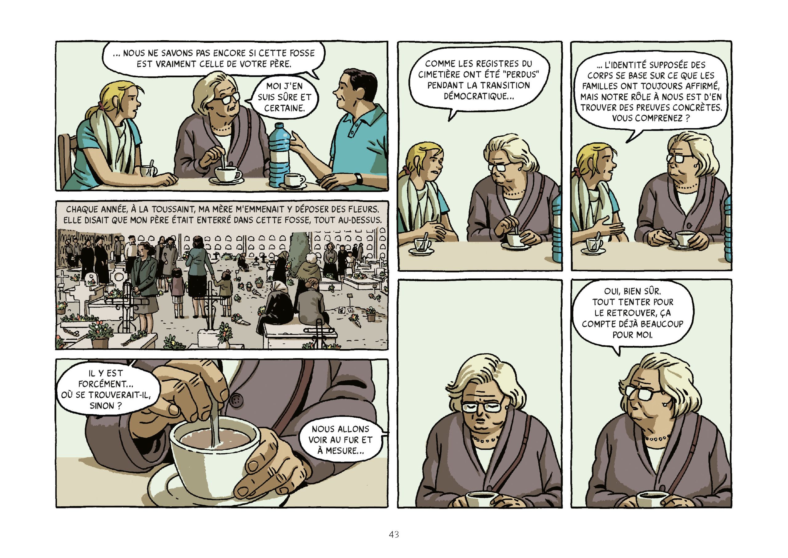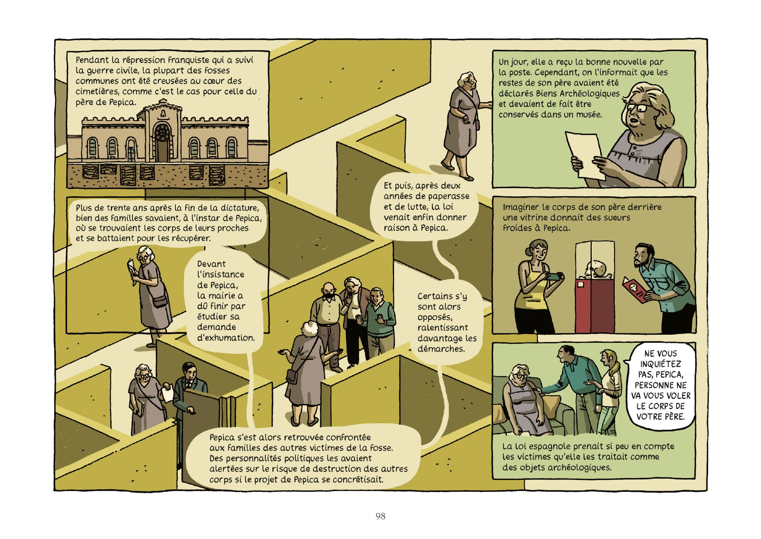 Ce livre est donc un documentaire en bande dessinée. Mais si Terrasa apporte la matière historique et testimoniale, on sent que Paco Roca apporte sa science du récit. Présent et passé sont mêlés avec intelligence. Les situations qui n’avaient que peu de témoins peuvent donc être mises en scène, autant que les actions concrètes menées par les archéologues et les familles de victimes. Terrasa et Roca sont absents du récit, la parole est donnée aux actrices et aux acteurs de l’histoire. Eux se font discrets, passeurs de parole. Un parti pris fort pour laisser lectrices et lecteurs connectés aux émotions.