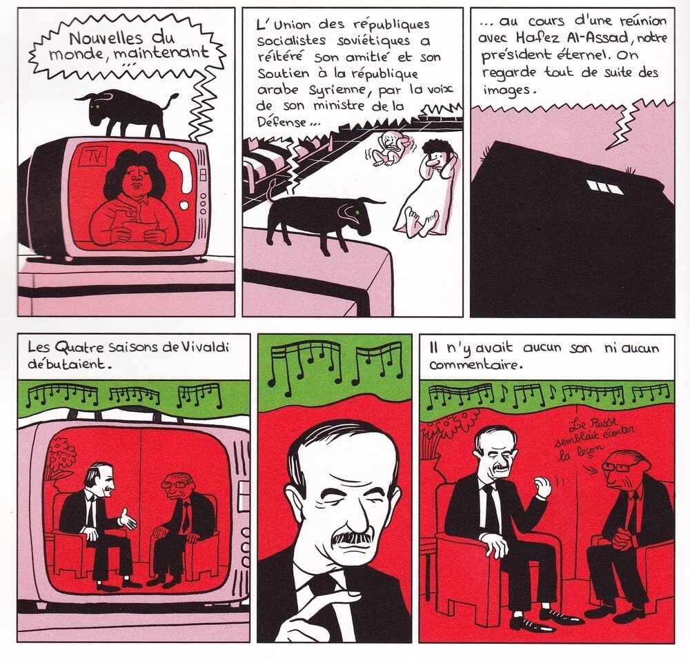 La vie paysanne et la rudesse de l’école à Ter Maaleh, les courses au marché noir à Homs, les dîners chez le cousin général mégalomane proche du régime, les balades assoiffées dans la cité antique de Palmyre : ce tome 2 nous plonge dans le quotidien hallucinant de la famille Sattouf sous la dictature d’Hafez Al-Assad.