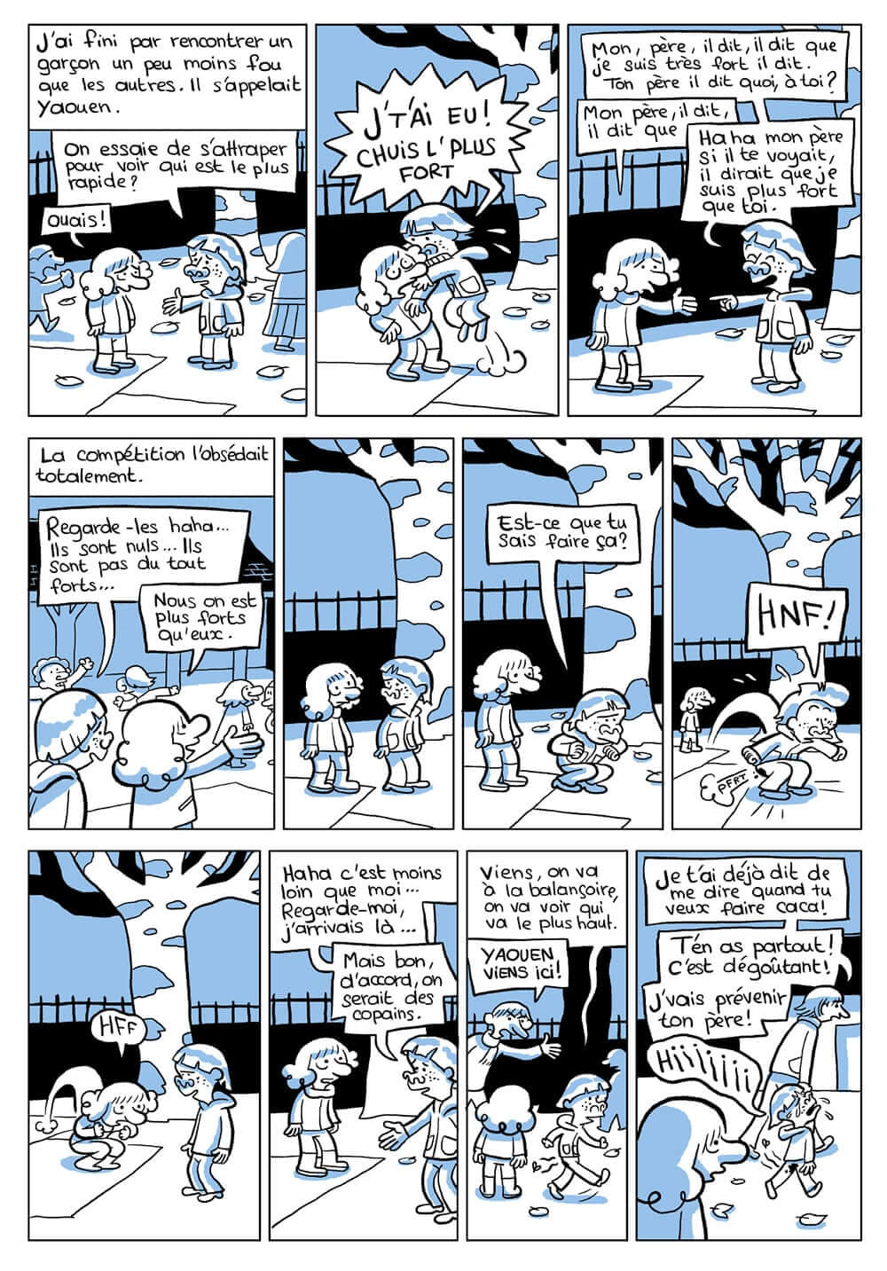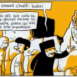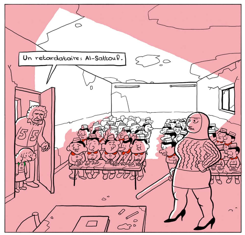 Dans le premier tome, on avait découvert le petit Riad, fragile bonhomme aux cheveux blonds ballotté entre la Libye, la Bretagne et la Syrie. On le retrouve ici pour sa première année d’école en Syrie ( 1984-1985 ). C’est l’année de ses six ans. La famille de Riad est revenue vivre au village, près de Homs. Sur les bancs de l’école, Riad est confronté à une double réalité : le racisme anti-juif de ses petits camarades parce qu’il est blond et les châtiments corporels qu’une institutrice lui inflige, portant avec son hijab « des jupes serrées et très courtes . Quand elle parlait, elle avait un visage apaisé et une voix très douce. Mais juste avant de frapper avec son bâton, elle se mordait la lèvre inférieure et son visage exprimait la haine absolue « .