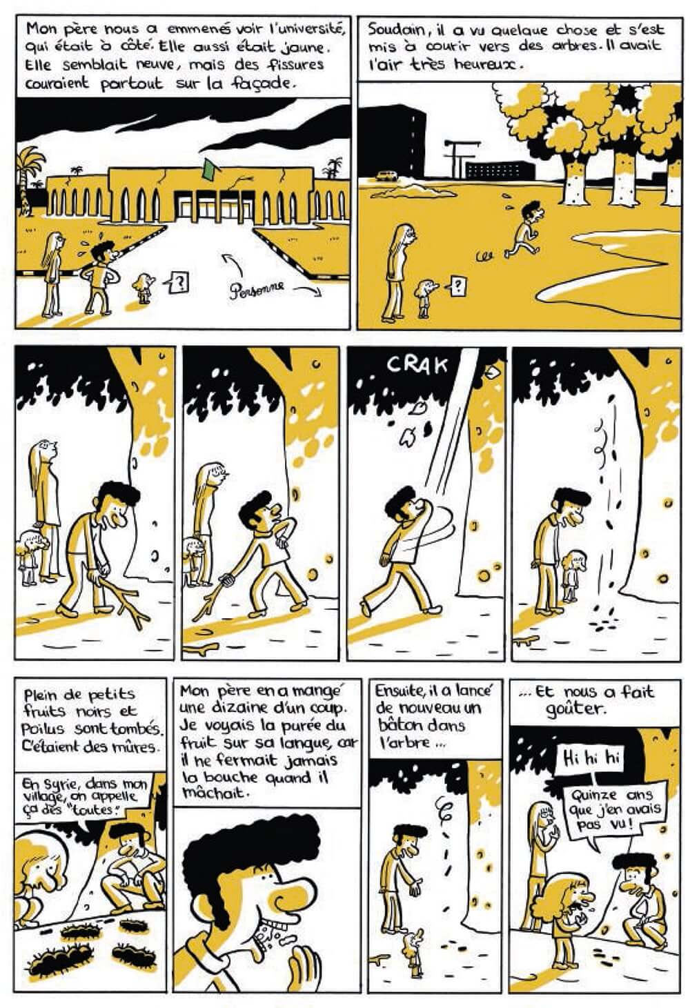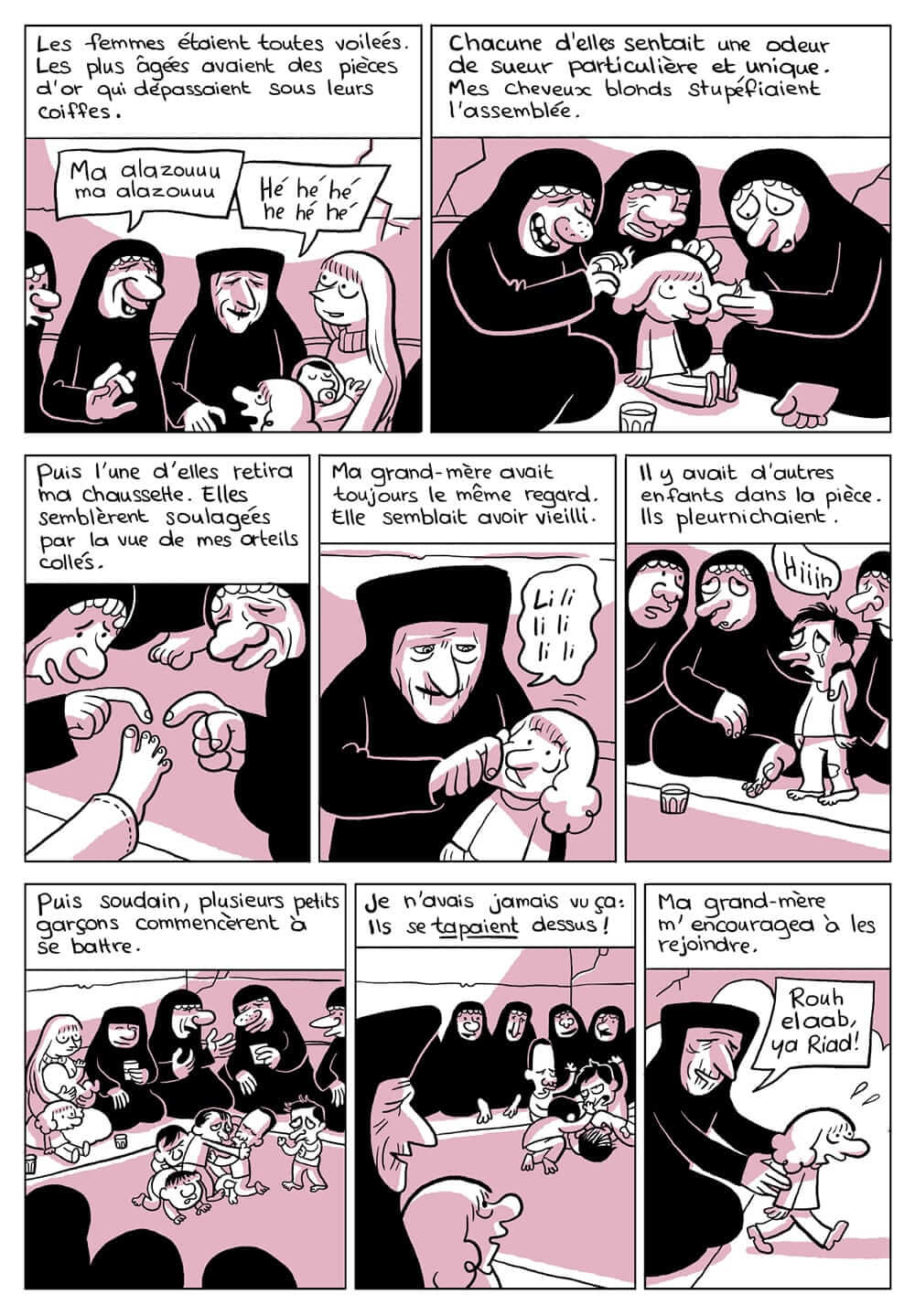 Il faut une bonne dose de talent pour savoir raconter des souvenirs intimes et les faire partager au plus grand nombre. Riad Sattouf y parvient, sans pathos, et nous rend familiers des personnages hauts en couleurs. Il y a, on l’a vue, cette maîtresse d’école « ogresse », cette femme de général qui porte sur elle 4 kilos de bijoux en or, cette partie de chasse où le père massacre des moineaux et les cuisine, cette nuit d’angoisse où sa cousine Leïla disparaît… Autant de petites anecdotes, de moments tragi-comiques ou tristes qui émaillent la petite enfance de Riad et que l’auteur nous restitue des années plus tard. Toutes ces histoires dans l’histoire finissent par nous révéler la toile d’un pays déjà livré à la dictature.
