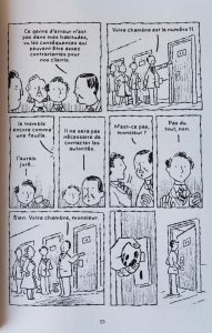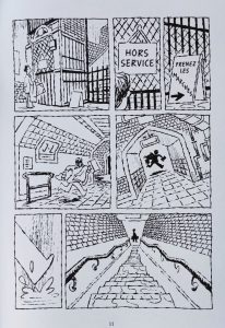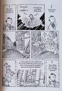 Comme son précédent album, Andi Watson mise sur l’absurde et le surréalisme. Tout est fou dans L’autre tournée. Les liens représentés par les personnages croisés par Sebastian se succèdent sans ligne directrice. Chacun tire dans son sens. Clients et policiers ont des postures et des dialogues qui entraînent le pauvre Mortimer dans une abîme où l’on a l’impression qu’il ne sortira jamais. Comme un délire kafkaïen. D’ailleurs est-ce que Sans K. le titre du roman de Fretwell fait référence au héros du Château de Kafka ? Sûrement. Le protagoniste de l’auteur pragois n’arrive jamais à entrer en contact avec Klamm, un haut fonctionnaire. Comme Sebastian avec Mrs Doveshall.