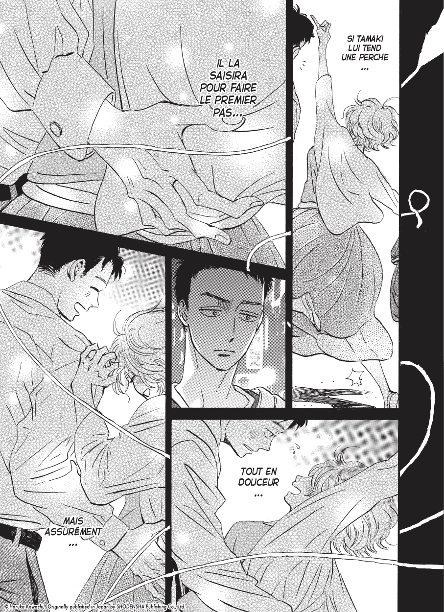 Haruka Kawachi se sert de ces battements réguliers qui nous sont familiers pour lui permettre de multiplier les idées narratives et visuelles. Ils mettent en évidence les sentiments et les désirs des personnages. À l’image d’Agawa qui suit un atelier de confection de mouchoirs avec des fils à tisser aux côtés de Tamaki et Marie, animé par Kinugasa. À cet instant, il se remémore une scène de danse entre Tamaki et Kinugasa. Le découpage et le fil du tissu nous guident sur les liens qui se relient entre les deux personnages par des gestes discrets. Jusqu’à la page où Kinugasa observe le tissu de la toupie à fil virevolter, comme Agawa qui tourne en rond au rythme de cette nouvelle valse menée par un nouveau chef d’orchestre.