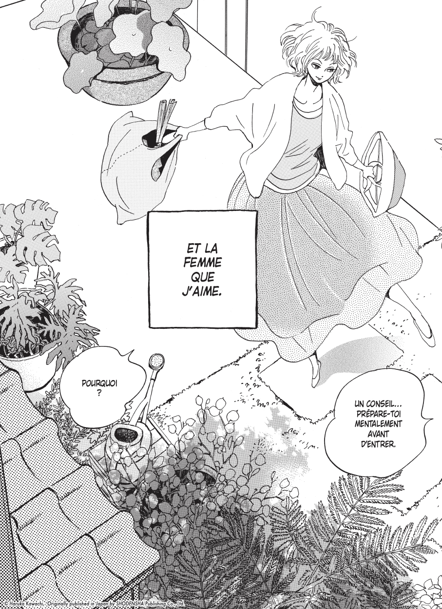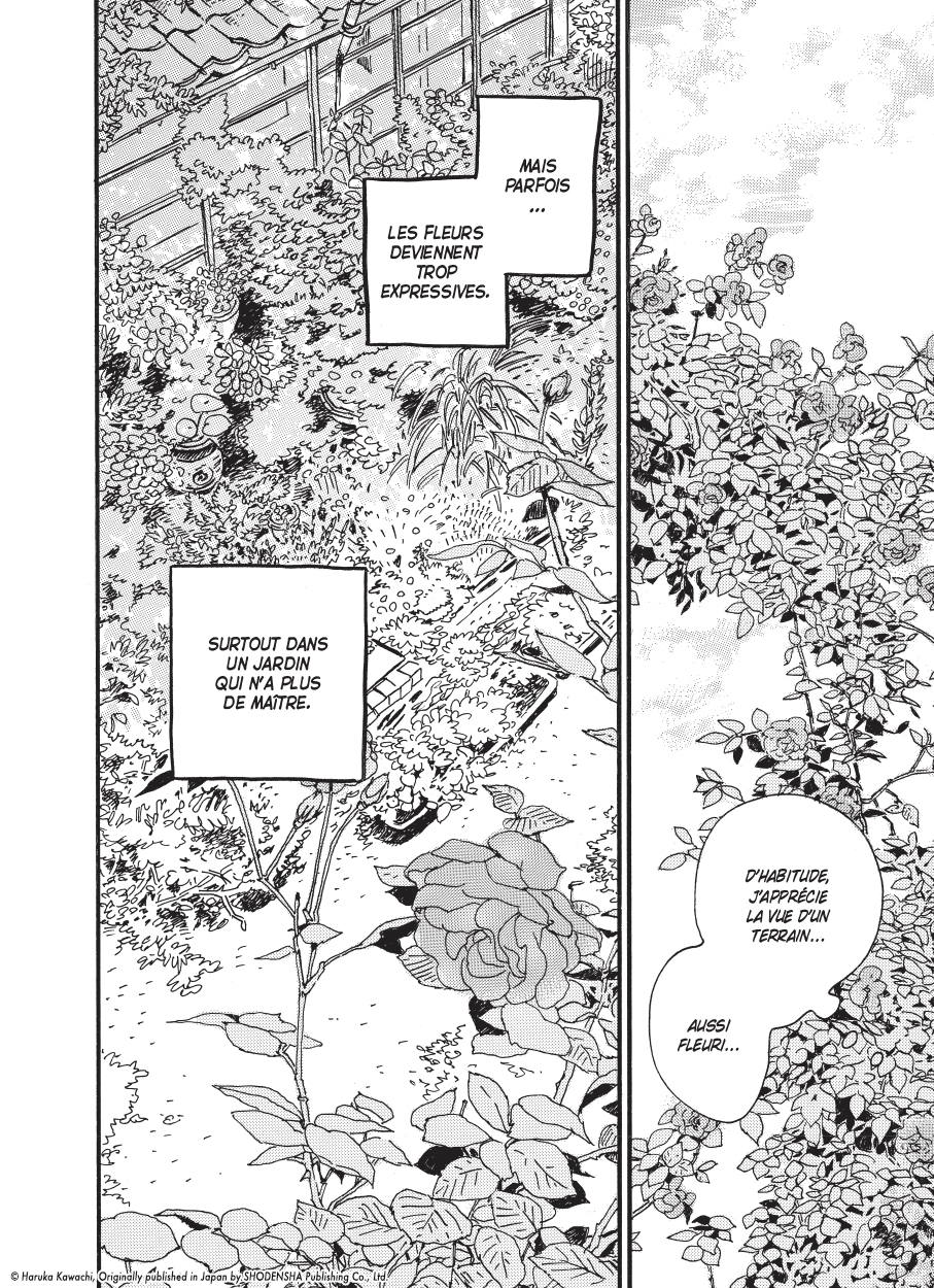On y voit de cette façon l’une des particularités d’Haruka Kawachi qui me fascine le plus, sa capacité à dépeindre la vulnérabilité humaine sous tous ses aspects. Elle permet d’exposer comment ces sentiments de regret et de résilience amènent à ces comportements humains imparfaits. Ils lui permettent de traiter de sujets délicats comme le deuil, la perte, à l’instar de « Les fleurs du passé ». Avec toujours un cadre omniprésent de plantes et de fleurs dans ses œuvres pour les décrire.