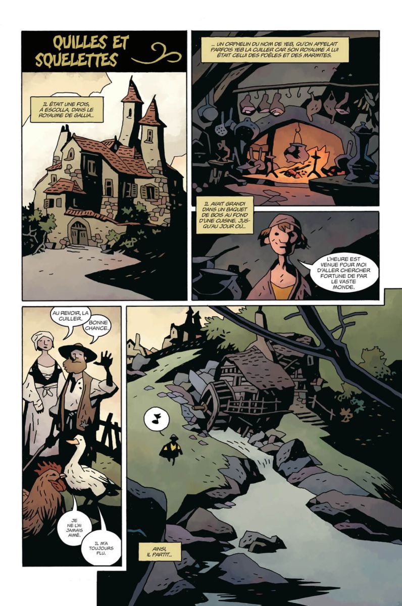 Et tout venant à point à qui sait attendre, cette fois-ci, le désir de créer est né d’une simple envie : « dessiner un gamin qui jouait aux quilles avec des ossements. ». En réalité, cette histoire s’inspire d’un conte folklorique italien qu’Italo Calvino a porté à la connaissance du plus grand nombre dans son recueil Fiabe italiane. On reconnaît alors immédiatement le style inimitable de Mike Mignola. Et sans qu’on s’en rende compte, on se retrouve plongé au cœur des Contrées Inconnues. Et pour notre plus grand plaisir, le voyage promet d’être long. Mais contre toute attente le père d’Hellboy ne va pas nous conter une simple histoire.