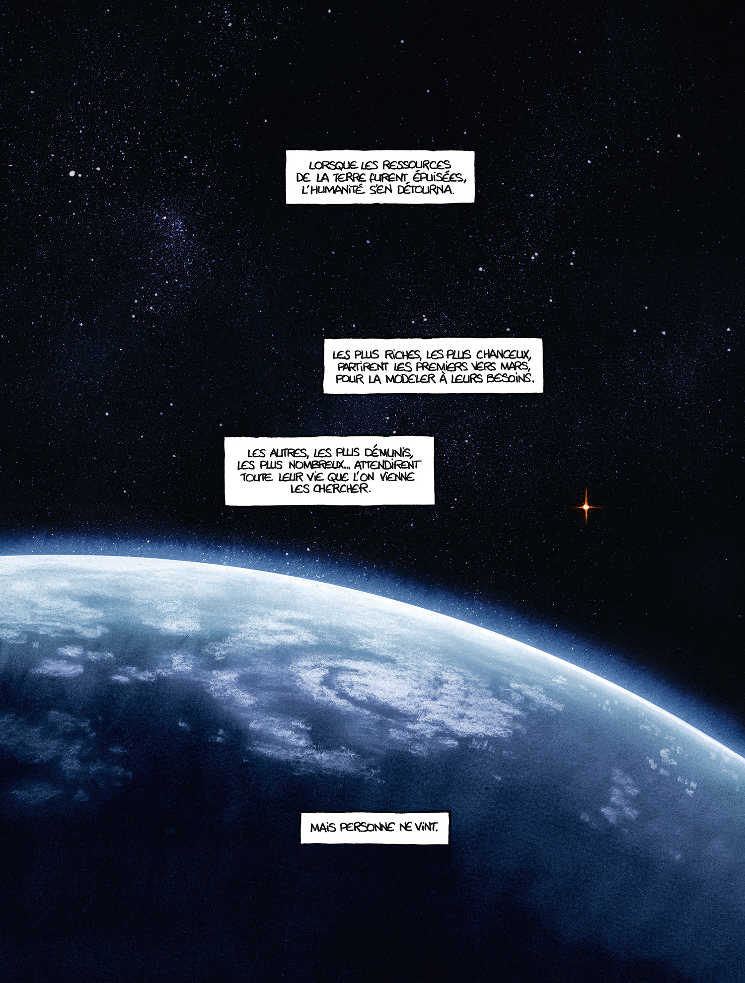 La Terre est vidée de toutes ressources. N’offrant plus d’intérêt à l’humanité, les plus chanceux ou riches la désertent pour peupler une autre planète : Mars. La nature reprend naturellement ses droits. Mais la planète bleue est encore investie de ces hommes et femmes qui attendent. Celles et ceux qui sont partis étaient leur espoir pour venir les chercher. Ils ne viendront jamais…
