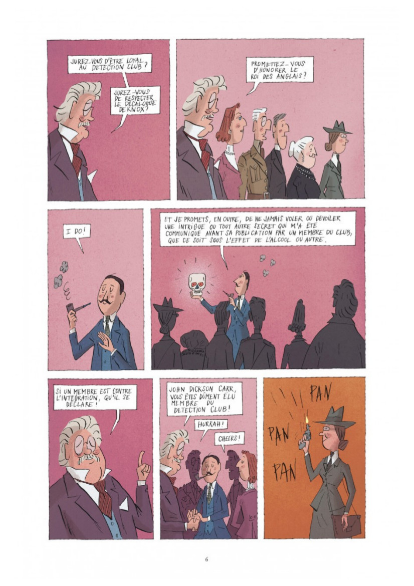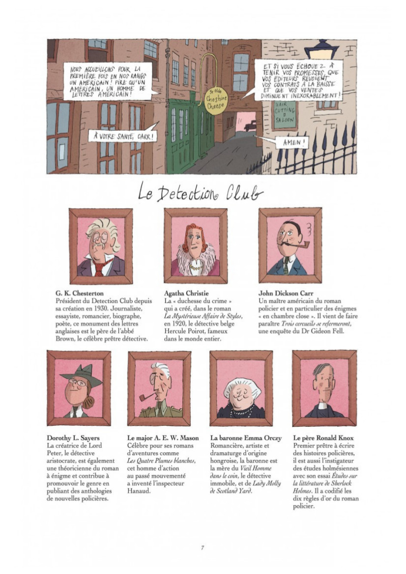 C’est G. K. Chesterton, le président du Club qui annonce la nouvelle, entouré d’Agatha Christie, Dorothy L. Sayers (créatrice de Lord Peter), le major A. E. W. Mason (créateur des Quatre plumes blanches), la baronne Emma Orcsy (créatrice du Vieil homme dans le coin) ou encore du père Ronald Knox (Etudes sur la littérature de Sherlock Holmes).