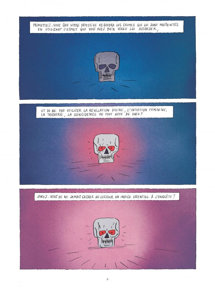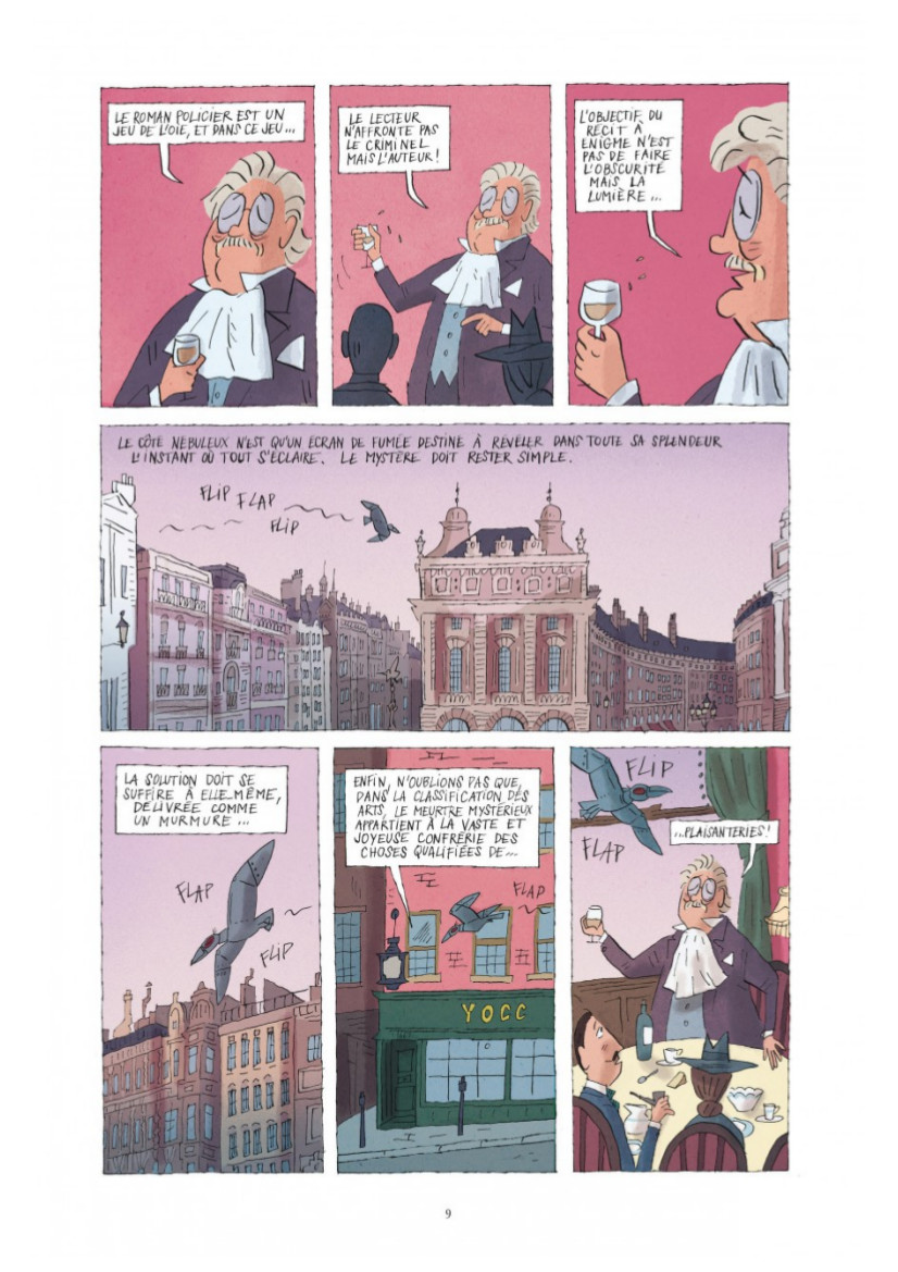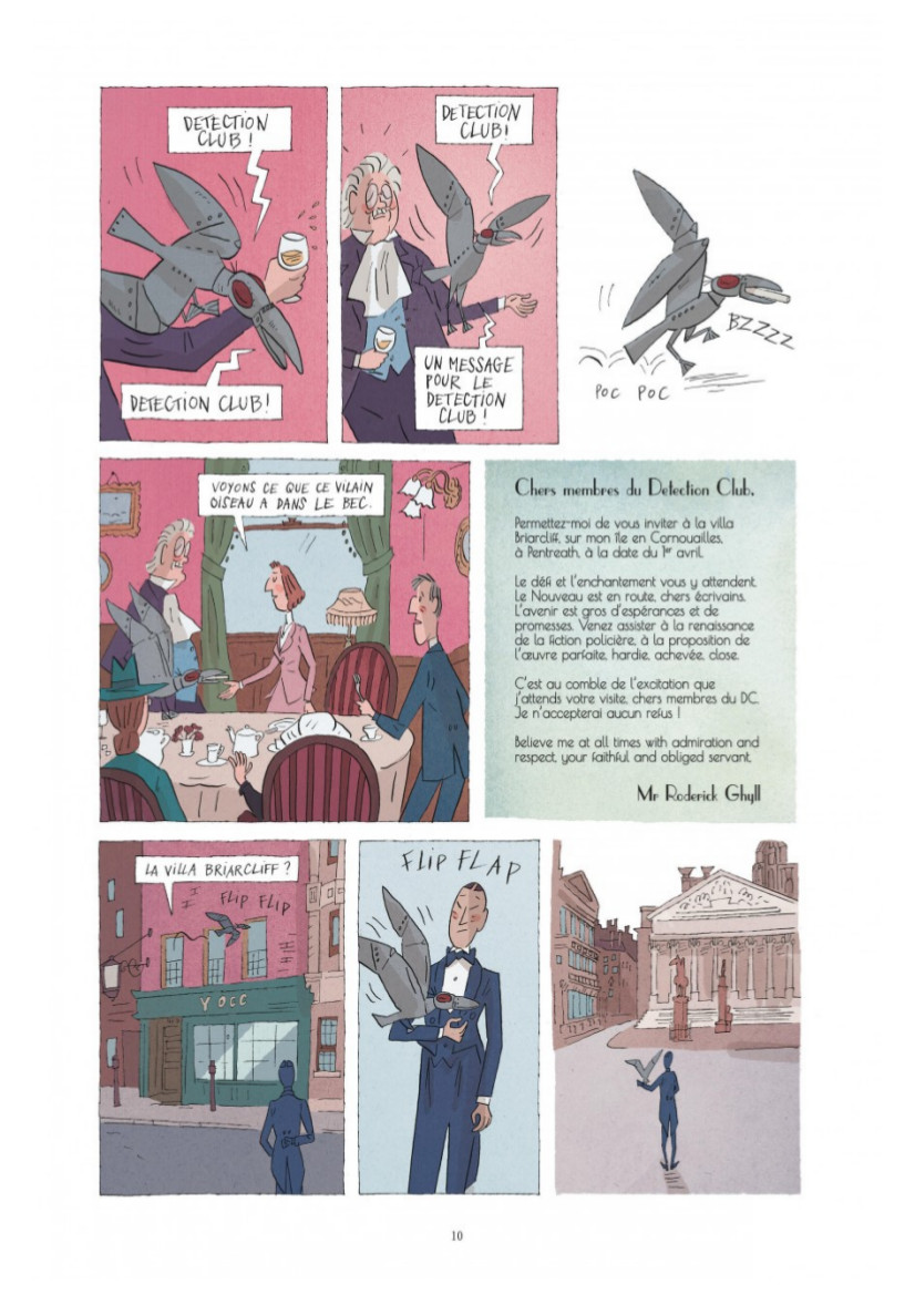 Après avoir énoncé les 10 règles d’or du roman policier, le repas d’intronisation peut débuter. Il est interrompu par l’arrivée d’un oiseau mécanique porteur d’un message.
