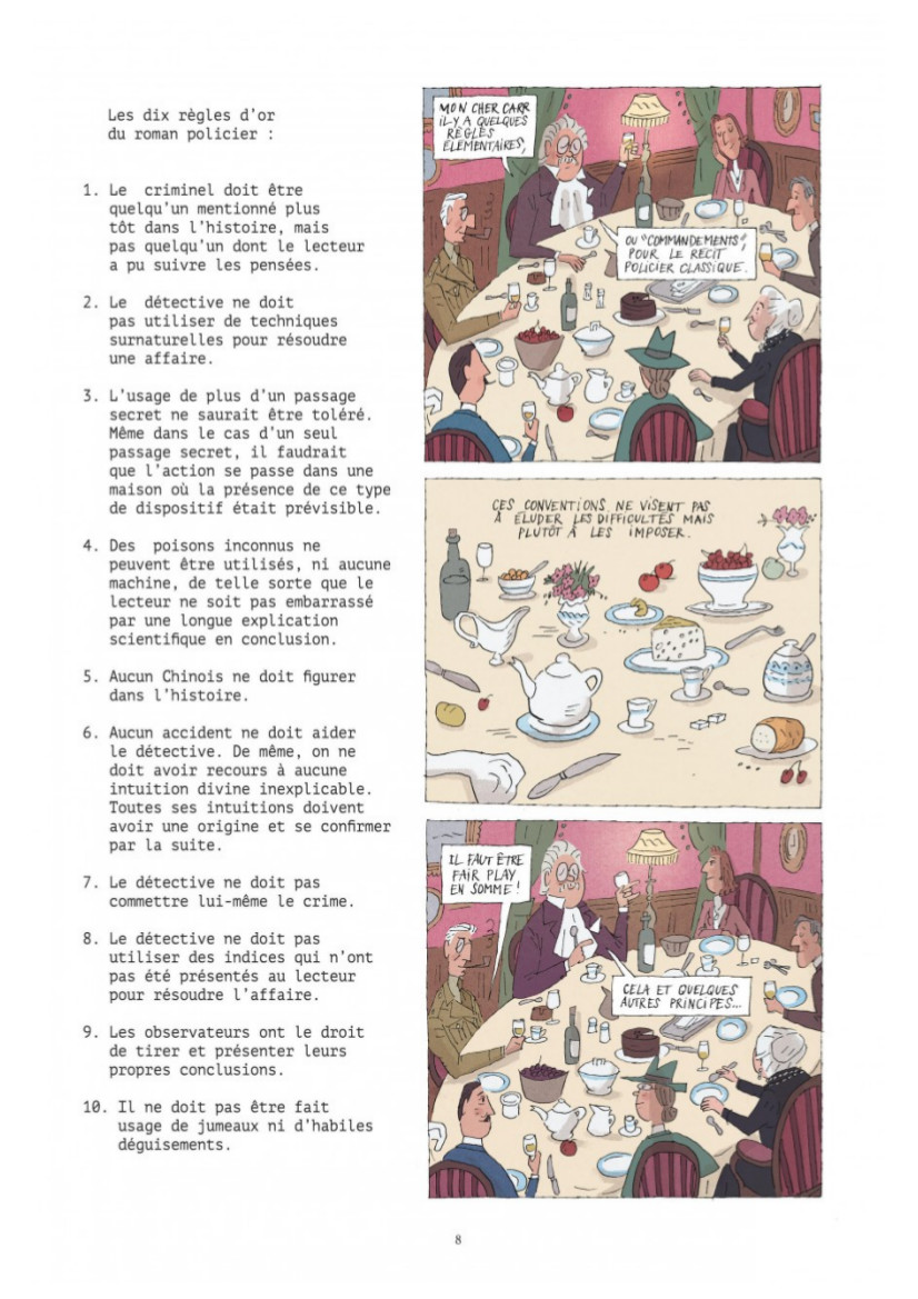 L’auteur d’Ulysse, les chants du retour (Actes Sud, 2014) convoque sept grands auteur.e.s de littérature noire : Christie, Chesterton, Carr, Sayers, Mason, Orczy et Knox pour une folle épopée dans les Cornouailles. Pour cela, Jean Harambat s’est basé sur le Detection Club, une cercle ayant vraiment existé et avec les mêmes écrivain.e.s. Créé en 1930, il est toujours en activité. Cette association a pour but de promouvoir la littérature polar. Ses membres y parlent des aspects techniques de l’écriture de livres policiers. Pour cela, ils doivent se tenir au Décalogue de Knox, établissant les 10 règles d’or des intrigues de nouvelles ou romans noirs :