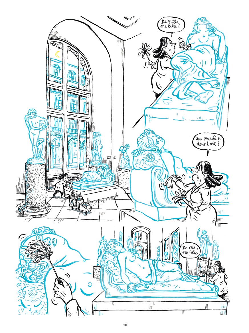 Pourtant ce n’était pas faute d’avoir prévenu la direction du musée de cet état de fait. En effet, depuis plus de 30 ans Teresa fait le ménage au Louvre. Ou plus exactement, elle prend soin de ces femmes nues ou peintes. Celles-ci le lui rendent d’ailleurs bien, puisque Teresa est maintenant capable de deviser avec elles. Et bien sûr, de comprendre leurs besoins et surtout leurs revendications.