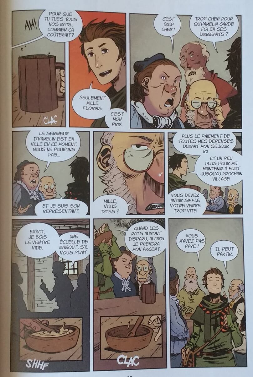 Très sûr de lui, il rencontre les notables de Hamelin pour offrir ses services. Moyennant de grosses sommes d’argent, il pourrait débarrasser la ville des rats par le simple son de sa flûte. Pour monter ce talent, il fait l’expérience sur Epi de maïs, le chien d’un villageois. Après d’âpres négociations, c’est décidé, le jeune homme est missionné pour éradiquer les rats…
