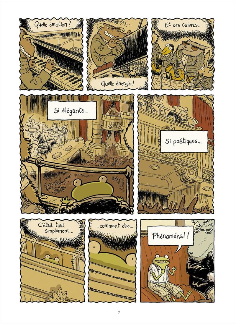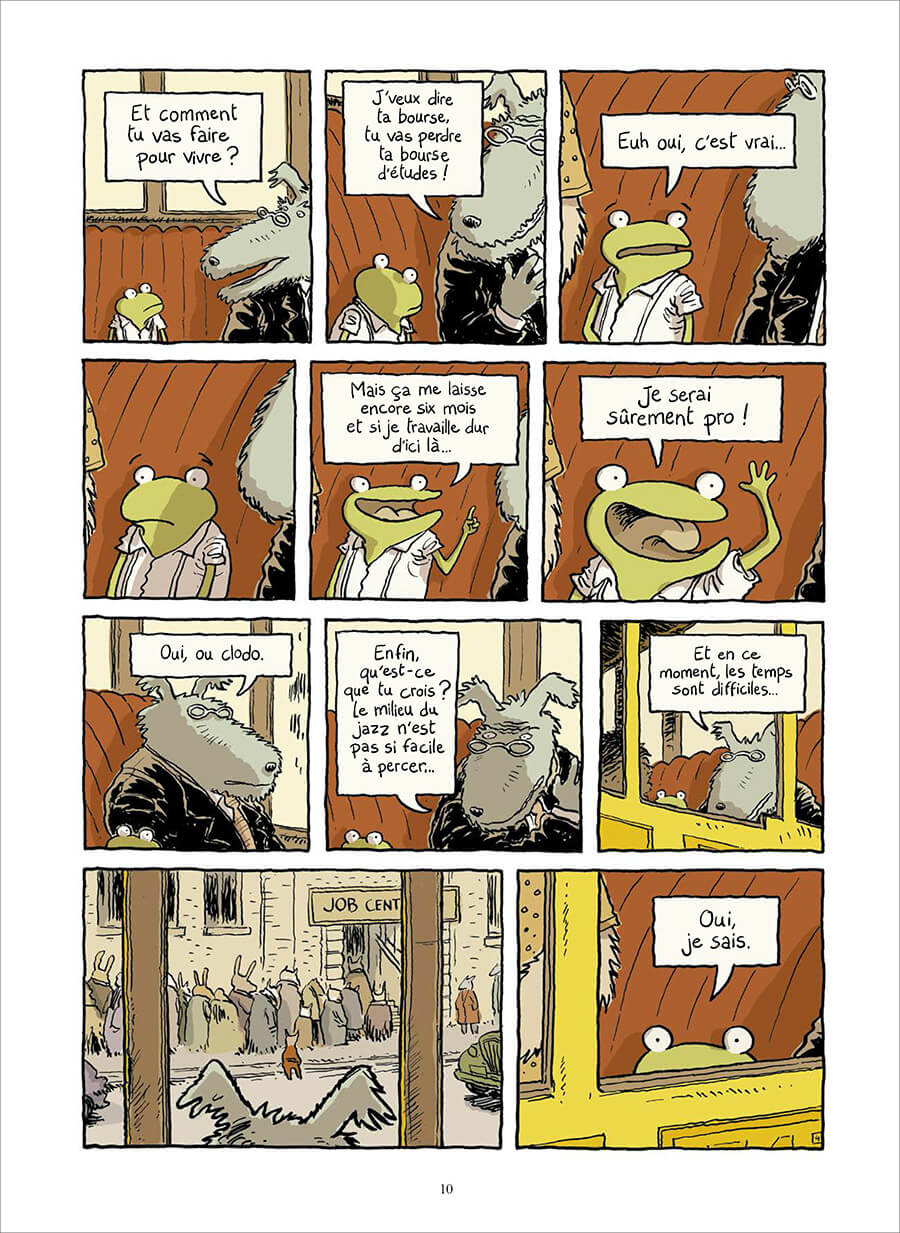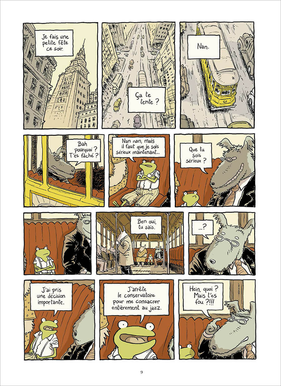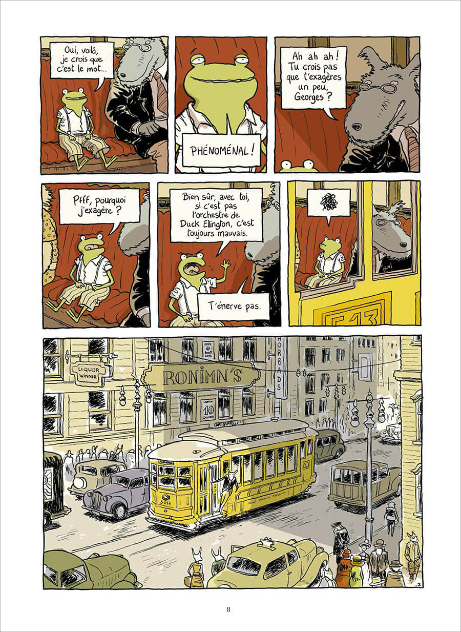 Résumé de l’éditeur : États-Unis, années 30. Georges Rainette, une grenouille au teint clair, rêve de devenir un grand jazzman. Son nom d’artiste… GEORGES FROG. Composer implique de longs tête-à-tête avec son piano, mais tout finit par s’accorder en lui lorsque son regard croise, un jour, celui de sa nouvelle voisine, Cora, la fille de M. Cat. Malheureusement, ce dernier – hostile à cette idylle – décide de déménager… Soutenu par ses amis, Georges reprend, peu à peu, goût à la vie : il accepte de donner des cours de musique, et même de monter un jazz band ! Il découvre alors la difficulté d’un milieu, d’un sytème social et finit par retrouver Cora. Mais pour elle, acceptera-t-il d’oublier son rêve, au risque de s’oublier lui-même ? La survivance d’un artiste au sein d’un monde codifié dans lequel il lui sera difficile de choisir entre deux passions…
