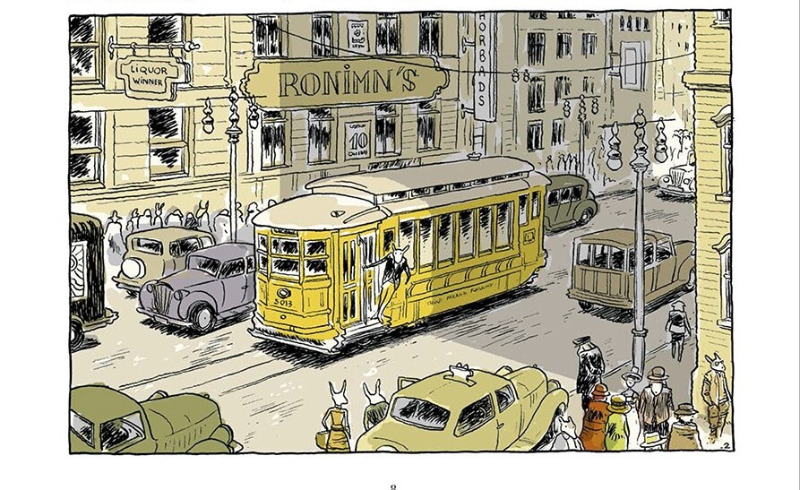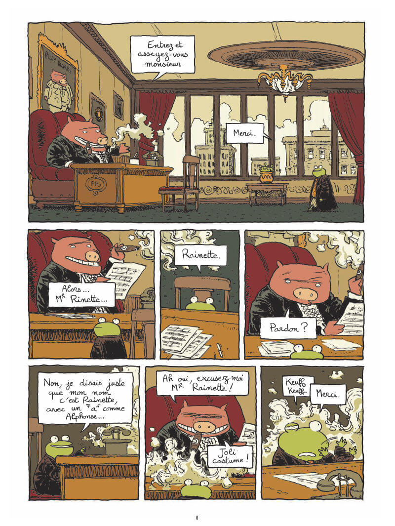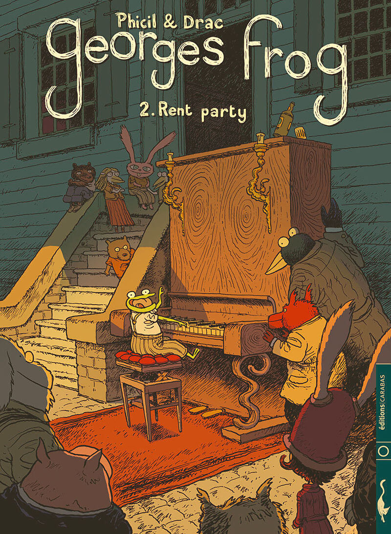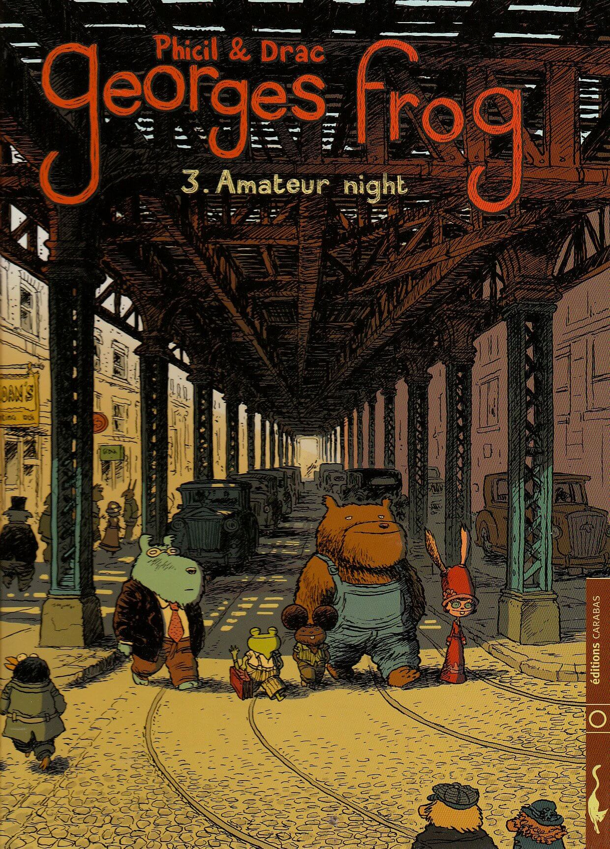 Résumé de l’éditeur : États-Unis, années 30. Georges Rainette, une grenouille au teint clair, rêve de devenir un grand jazzman. Son nom d’artiste… GEORGES FROG. Composer implique de longs tête-à-tête avec son piano, mais tout finit par s’accorder en lui lorsque son regard croise, un jour, celui de sa nouvelle voisine, Cora, la fille de M. Cat. Malheureusement, ce dernier – hostile à cette idylle – décide de déménager… Soutenu par ses amis, Georges reprend, peu à peu, goût à la vie : il accepte de donner des cours de musique, et même de monter un jazz band ! Il découvre alors la difficulté d’un milieu, d’un sytème social et finit par retrouver Cora. Mais pour elle, acceptera-t-il d’oublier son rêve, au risque de s’oublier lui-même ? La survivance d’un artiste au sein d’un monde codifié dans lequel il lui sera difficile de choisir entre deux passions…