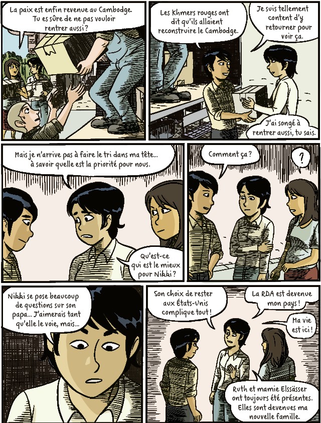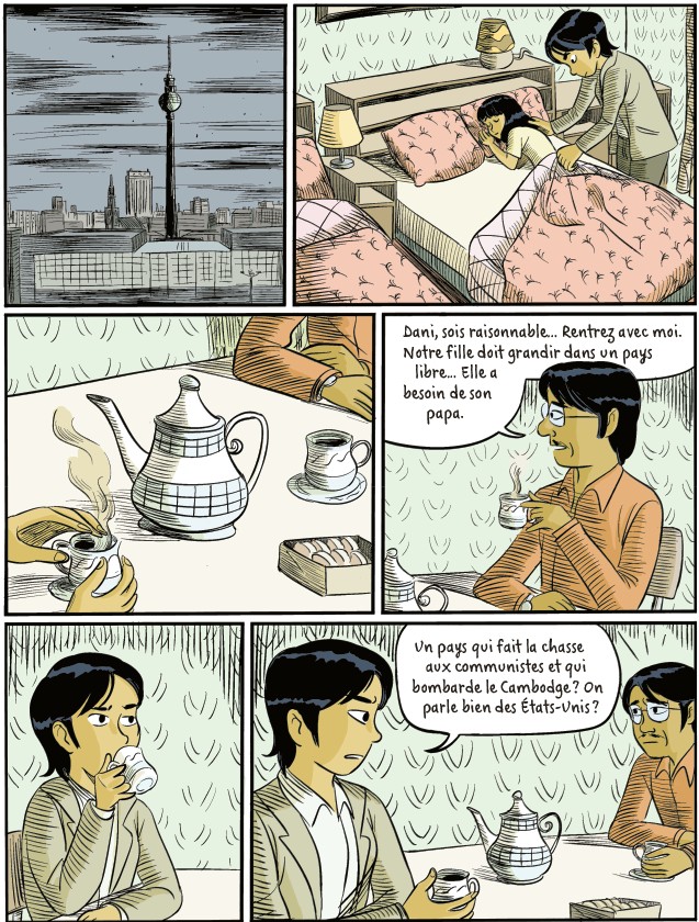 Avec cet album, Tian, auteur né au Cambodge en 1975, trois jours après l’arrivée au pouvoir des Khmers rouges, nous raconte l’histoire vraie de cette femme cambodgienne exilée en RDA. Avec un trait marqué et ombré, une coloration aux tonalités ternes reflétant la vie sans artifices sous le régime communiste, l’auteur de L’année du lièvre dresse un état fidèle de cette époque opposant l’Est et l’Ouest.