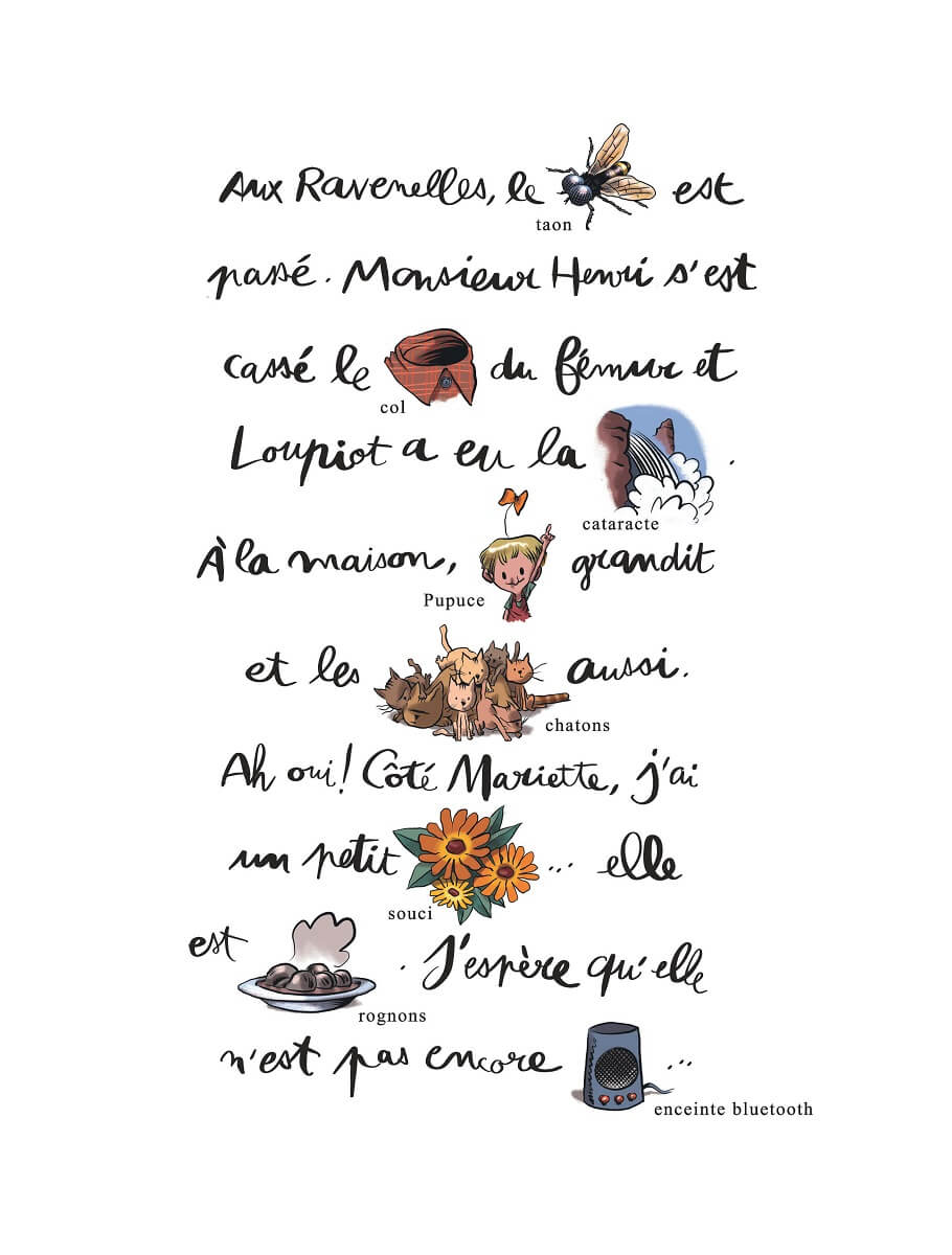 Pourtant, Capucine grandit et commence a faire des phrases. Cela devrait l’enchanter Manu. Mais non. Les chats – de plus en plus nombreux – sont dans les cartons et Mme Mortemont vient d’acquérir un smartphone. Une gros smartphone auquel elle pose des tas de questions. M. Henri s’est cassé le col du fémur et papillonne, M. Loupiot doit se faire opérer de la cataracte et l’ermite est toujours autant énigmatique.