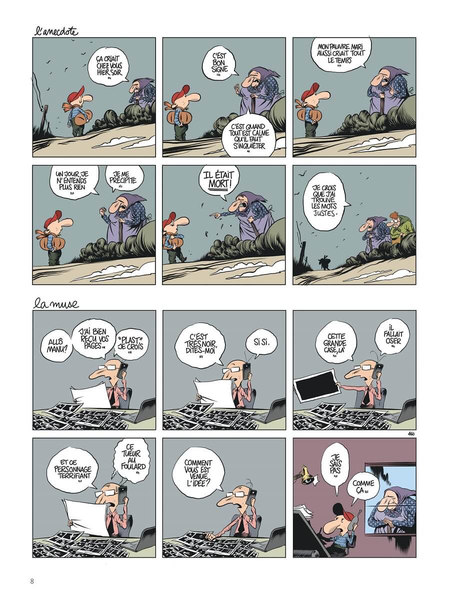 Les gags sur demi-planches évoquent aussi le couple, la paternité, la famille, les amis, la vieillesse, les souvenirs, le travail, la création et l’inspiration. Le tout porté par un humour décapant et le très bon dessin de l’auteur du Rapport de Brodeck.
