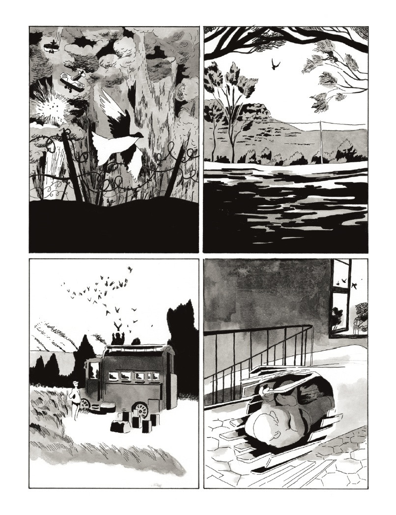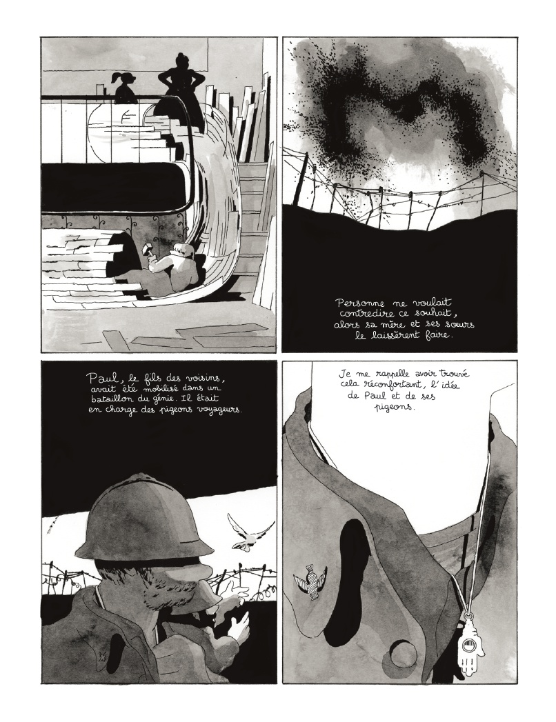 Résumé de l’éditeur : En 1919, dans le sud de la France, la guerre s’éloigne, le temps du retour a sonné. Mais les trains rapportent au pays autant de soldats que de tragédies. Les familles Rateau et Chaton attendent de revoir leurs hommes engagés sur le front. À l’ombre des arbres du grand jardin, l’espérance est un poison qui étouffe les coeurs. Seuls Alphonse Rateau, le mari de la narratrice, et Paul, le fils des voisins, reviennent vivants. En apprenant la mort de son père, le petit René entreprend de construire un gigantesque toboggan dans la maison familiale. Sans le savoir, il va affecter la cohérence de cet univers. Les deux familles ne tardent pas à assister à d’étranges événements. Un ptérodactyle fait son apparition dans le ciel et des fantômes arpentent soudain les chemins du parc. Un jour, René découvre que son toboggan ouvre des fenêtres temporelles. Et si cette invention pouvait apaiser les blessures et les déchirements?? Et si les traumatismes de la guerre pouvaient être effacés par la puissance salvatrice de la vie?? Antoine Cossé donne avec Le retour un livre de la maturité. Son dessin jouant des clair-obscurs fait ici merveille, dévoilant des émotions que les personnages répriment. Plongeant ses protagonistes dans les rouages d’une machinerie fantastique propre à libérer les âmes, il croise les destins d’individus confrontés au deuil et à la perte de sens dans une fresque intimiste poignante.