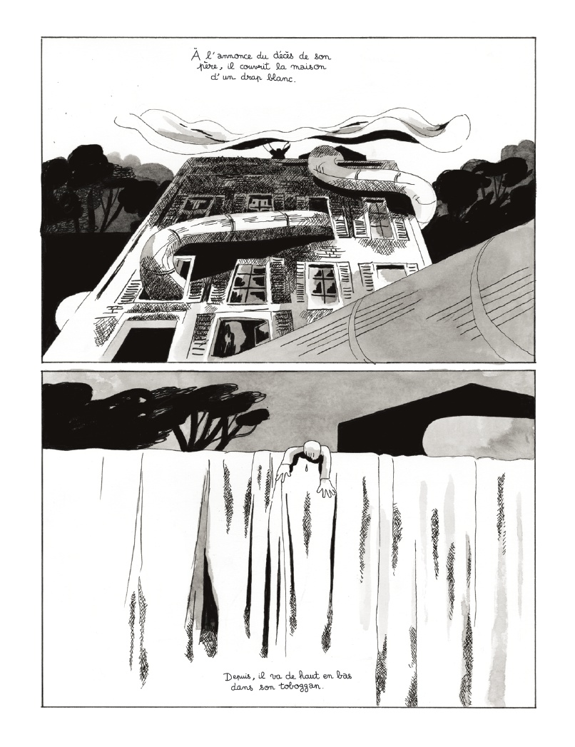 De son côté, René, en attendant que son père revienne de la guerre, a construit un immense toboggan passant à l’intérieur de la très grande maison familiale. Il a été impressionné par un manège de montagnes russes et a décidé de créer cette structure en bois. Cela lui a permis de faire passer le temps et de se dire que quand son père serait de retour, il serait fier de lui. Ce toboggan serait lui aussi magique…