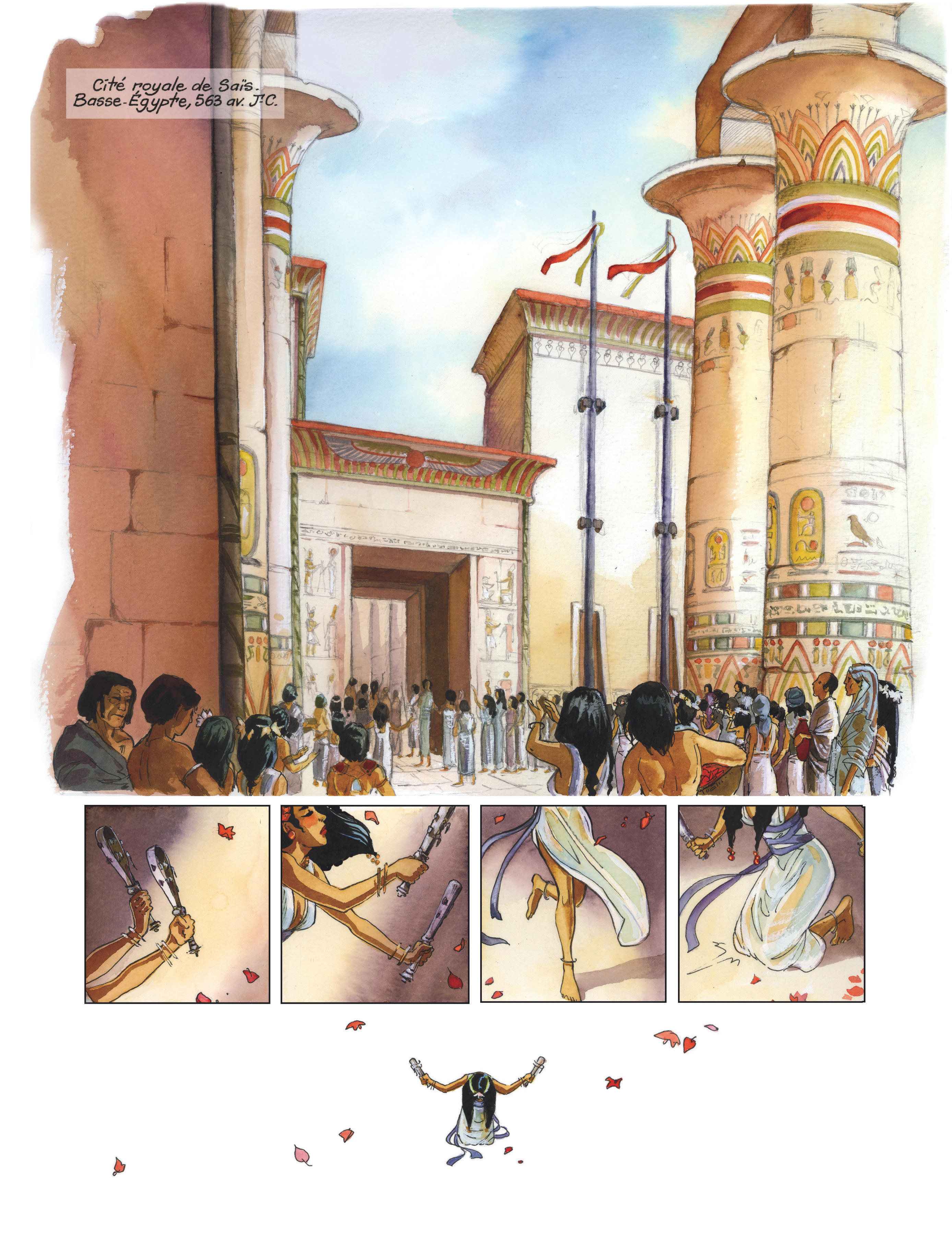 Saïs au nord de la Basse-Egypte en 563 avant notre ère. C’est jour de fête. Toute la cité royale se presse autour d’Iahmès Saneith, le pharaon tout puissant.