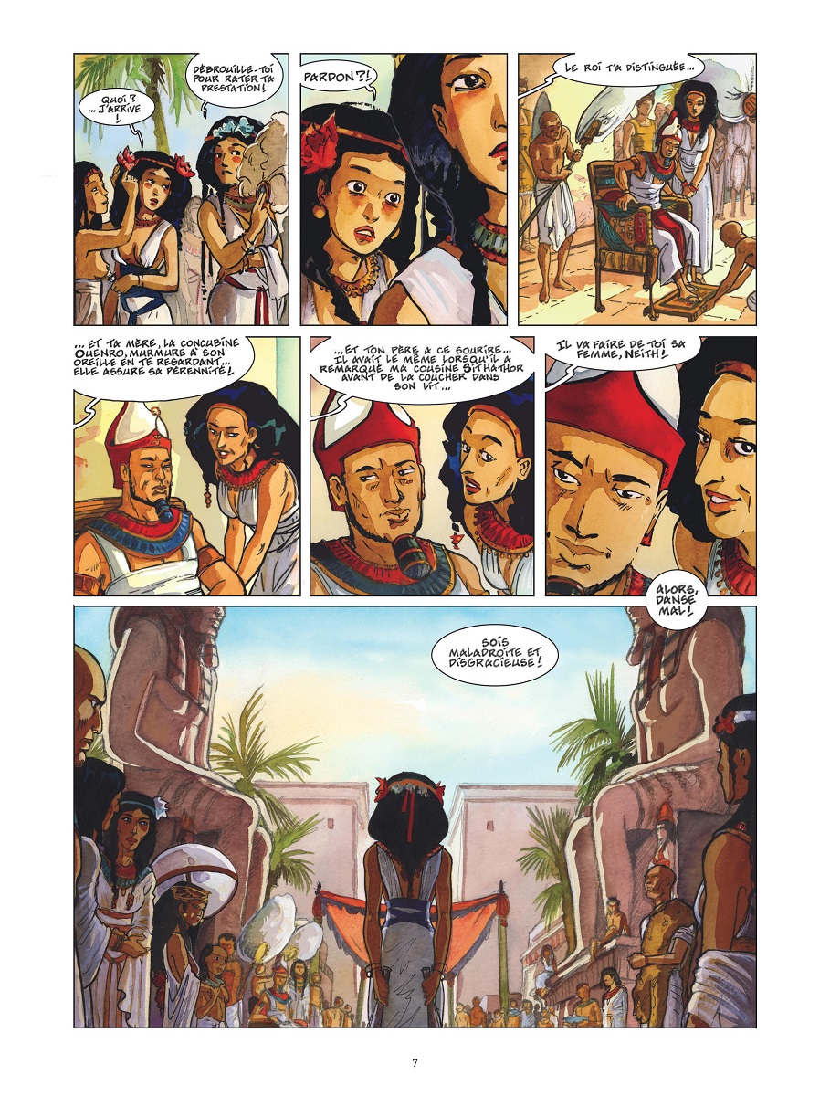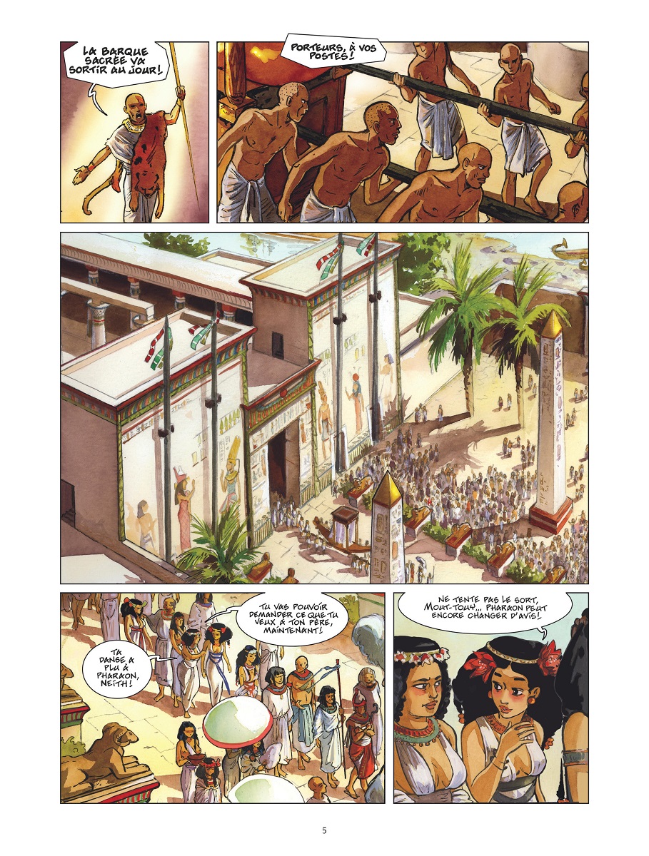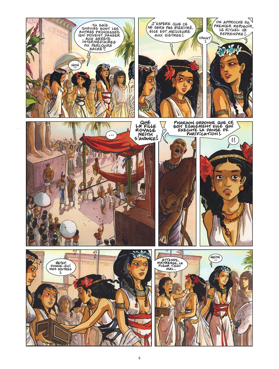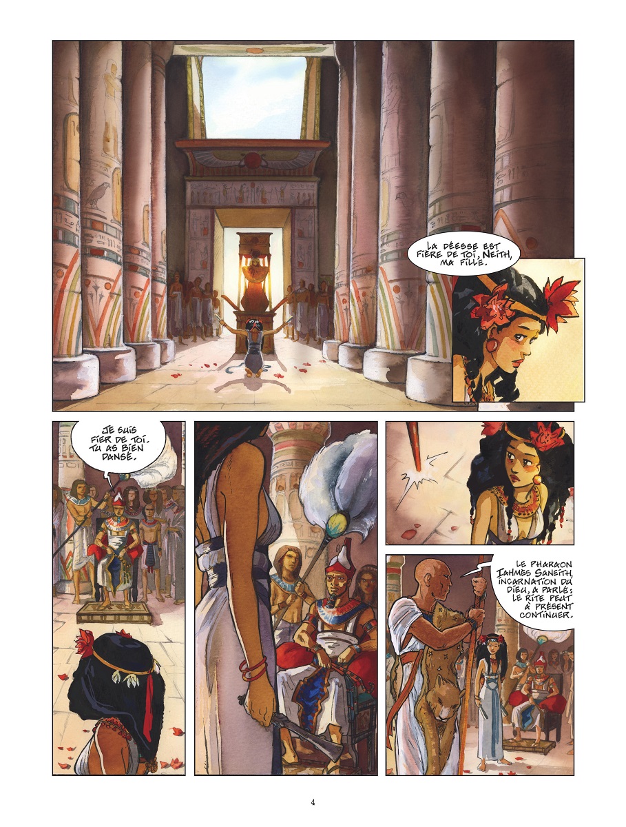 Parmi les danseuses, il y a Neith, l’une des filles du souverain. A chaque fois qu’une danseuse réussit une belle performance, Pharaon la prend pour femme. Même si Neith est sa fille, cela ne change rien, elle deviendra son épouse.