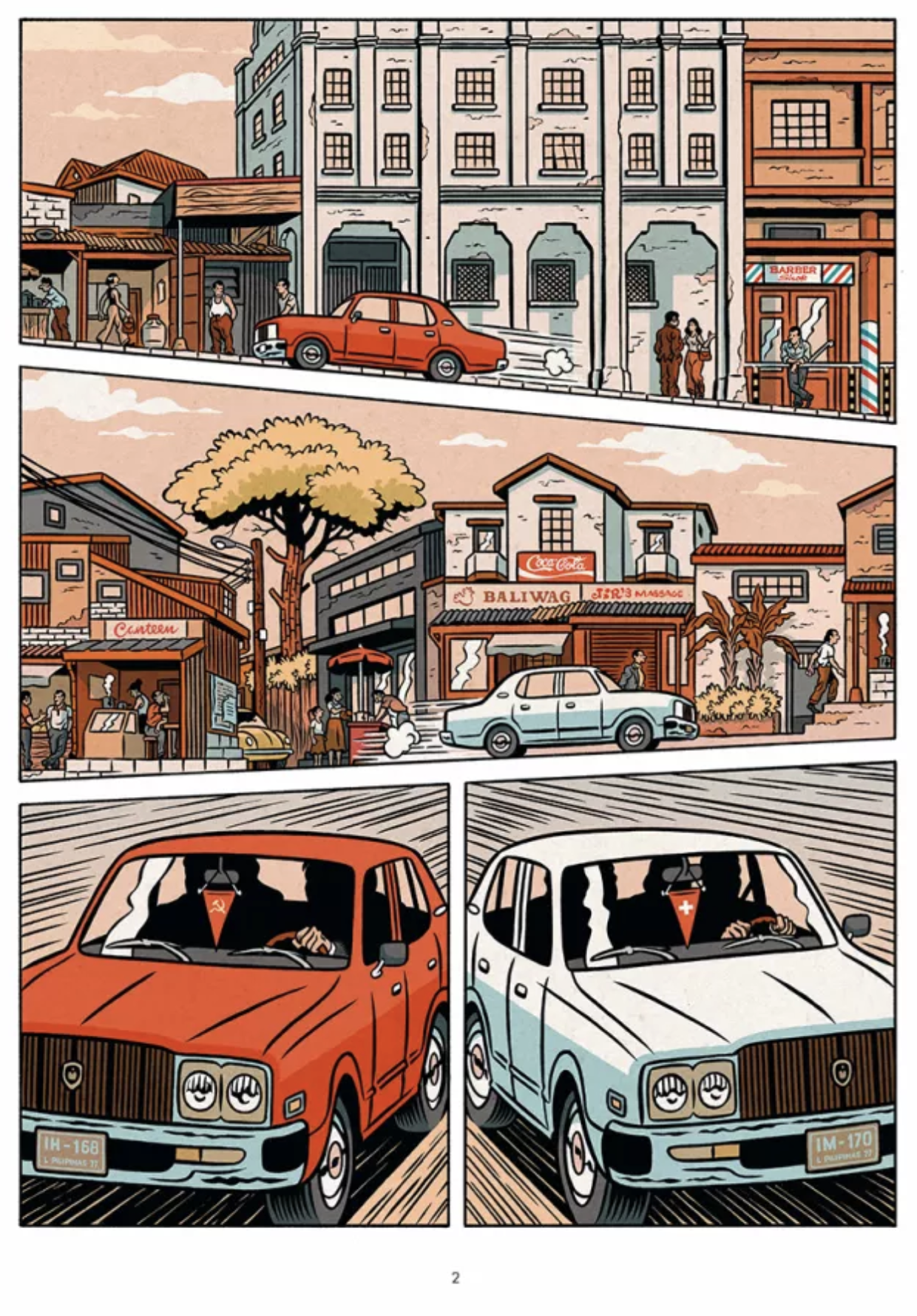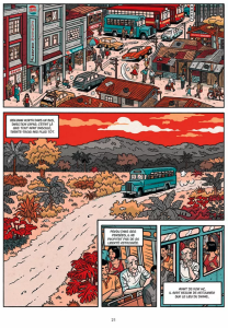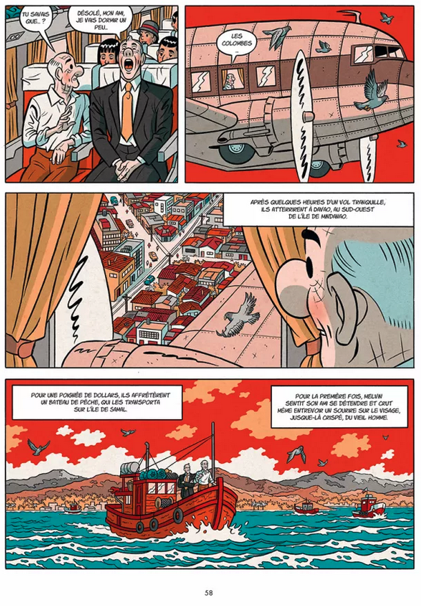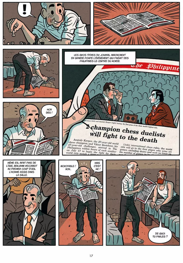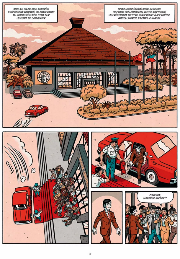 En même temps que l’on assistera aux retrouvailles puis aux investigations des deux compères qui se lancent dans une enquête policière, on suivra également l’étrange relation qui se noue en coulisse du palais des congrès de Baguio City entre Melvin Cob et Elena Dimatulak. La mystérieuse dame en rouge. Une femme élégante et séduisante qui s’intéresse, elle aussi de très près à la rencontre des deux champions d’échec. Elle pariant sur la victoire de Karpov, alors que Melvin veut croire que l’impulsif Kortchnoï peut renverser la table dans une partie assez mal engagée.