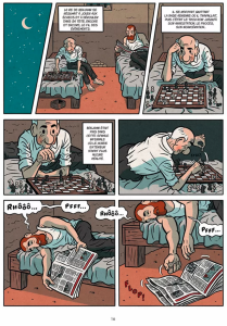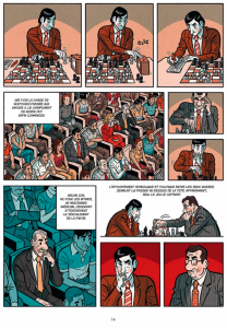 Et c’est encore une adaptation qu’il signe en tant que scénariste et dessinateur cette fois-ci. Une adaptation d’un roman de Javier Cosnava, qui n’est donc pas crédité comme scénariste sur cet ouvrage. L’histoire du Roi sans couronne est basée sur un fait historique, à savoir la tenue du championnat du monde d’échec de 1978. Le point d’orgue de ce championnat est un match qui a la réputation d’être l’un des plus étranges jamais disputés à ce niveau là. Cosnava et donc Carbos nous raconte ce match atypique bien sûr, mais ils y accolent une seconde trame narrative fictive qui donne un supplément de sel à ce récit.