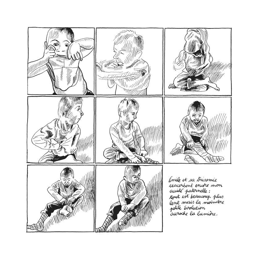 Rozenn – sa compagne qui ne souhaite pas apparaitre dans l’album – s’effondre. L’annonce est dure et percutante. Leur troisième enfant, né prématurément, « ne sera pas comme les autres ». La douleur est imprescriptible et se télescope avec le long effacement de sa mère.
