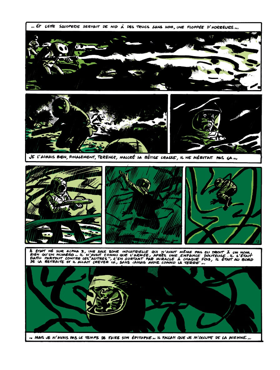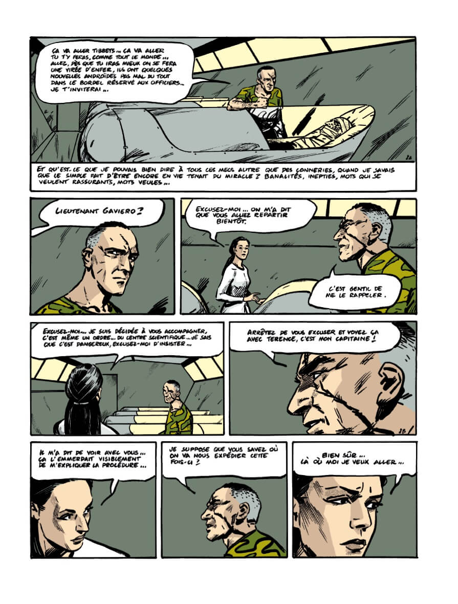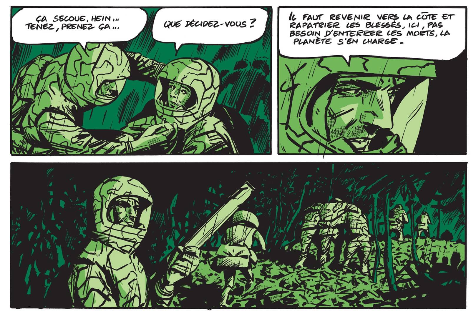 Juan Gaviero, lieutenant, et son unité ont débarqué sur une planète des plus hostiles. En effet, des larves immondes se défendent en traversant les scaphandres et pondent alors à l’intérieur, infligeant de terribles souffrances. Quelques uns en réchappent néanmoins. Les armes des soldats sont quasi inoffensives sur les créatures.