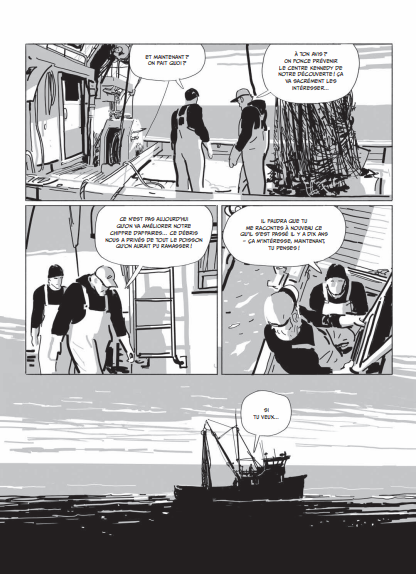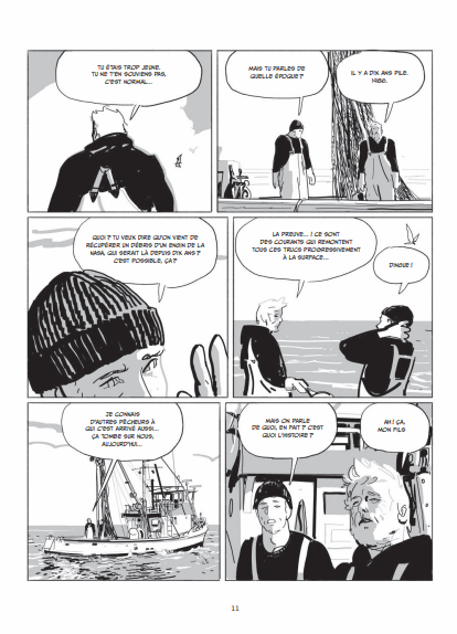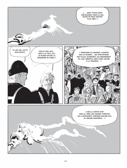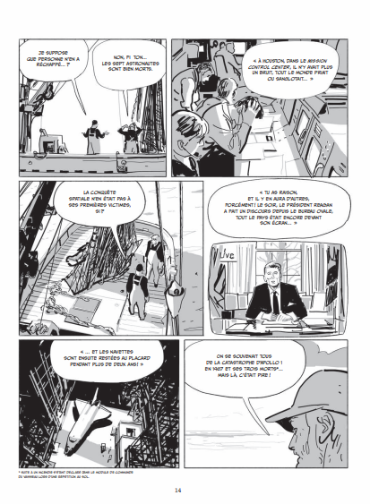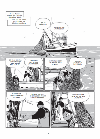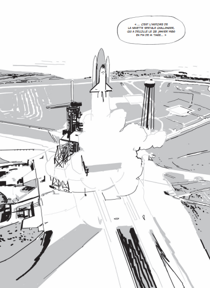 Résumé de l’album: Fin des années 90, un père et son fils pêcheurs, remontent dans leurs filets un mystérieux débris estampillé du logo de la NASA. L’occasion pour le père de se replonger dans le souvenir d’un drame survenu dix ans plus tôt : l’explosion tragique de la navette Challenger, le 28 janvier 1986. À bord, sept astronautes, dont deux civils, trouvent la mort une minute à peine après le décollage, sous le regard horrifié de millions d’américains rivés à leur écran de télévision.