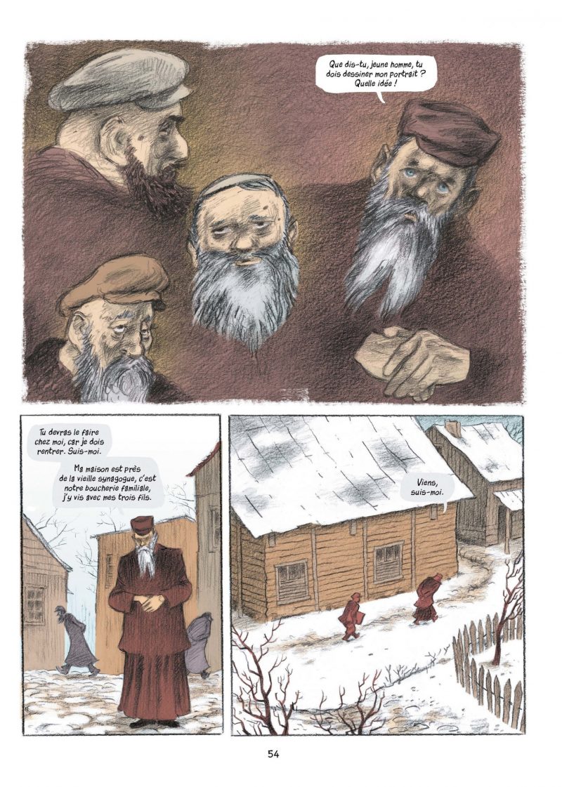 Encore mal connu du grand public, personnage aux multiples vies, Chaïm Soutine, le petit russe né en 1893 dans une famille juive orthodoxe près de Minsk intrigue encore aujourd’hui. Sans livrer une biographie détaillée, les auteurs s’attachent ici à lever un coin du voile . On sent, tant dans le récit proposé par Grolleau que dans le crayonné à la fois bouillant et subtil de Legars toute l’affection des auteurs pour leur sujet.