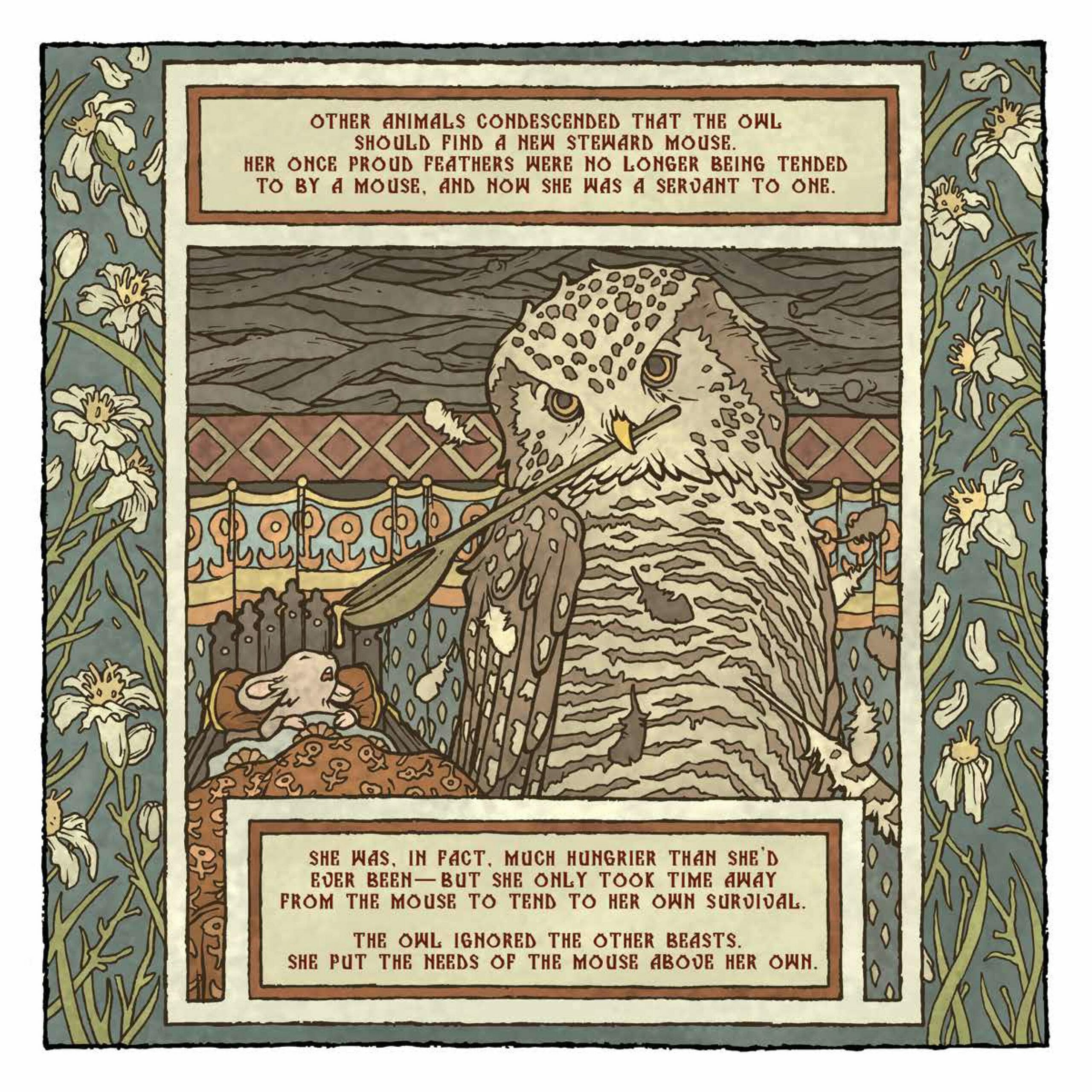 - La chouette au grand coeur : Au chevet d’un père mourant, une femme raconte à son fils l’histoire d’une chouette bienveillante envers une souris. L’auguste oiseau avait pour serviteur ce petit être. Mais malade, il dût s’occuper d’elle…